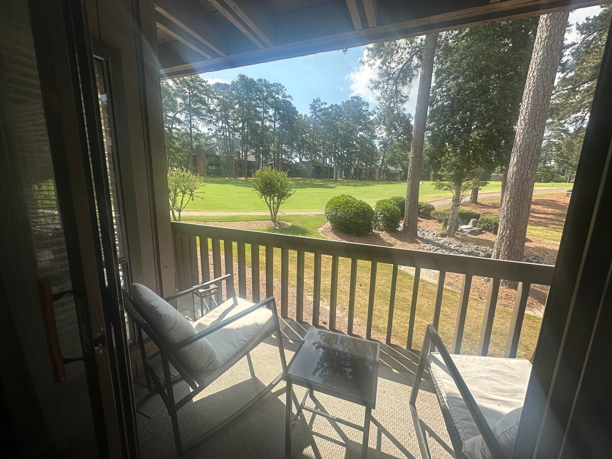 Frente a la pista de arnés y a poca distancia a pie de la casa club principal de Pinehurst se encuentra nuestra villa en el segundo hoyo del Pinehurst No. diseñado por Ellis Maples. 5. Nuestra unidad de 2ª planta recién renovada tiene 3 dormitorios, 2 baños y un plano de planta abierta. Con capacidad para 8 personas y 5 camas, puedes traer a toda la familia cómodamente. Prepara la cena en la cocina equipada con nuevos electrodomésticos de acero inoxidable y disfruta de una copa de vino de la nevera. Esta unidad tiene dos porches, y ambos son ideales para tomar el café por la mañana.