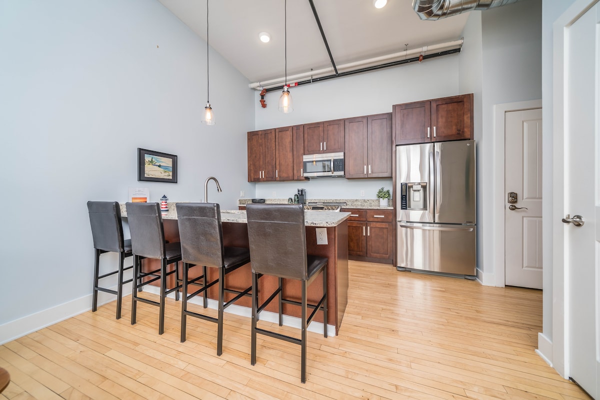 A stylish, historic lower-level loft featuring exposed brick and ductwork paired with true floor-to-ceiling walls for much-needed privacy. Designed by a family for families, this South Haven retreat blends charm, comfort, and convenience in a walkable location close to South Haven's countless activities. Amenities at Central Lofts include year-round access to a pool and hot tub, a fitness room, and seasonal access to a spacious shared patio with three grills.
