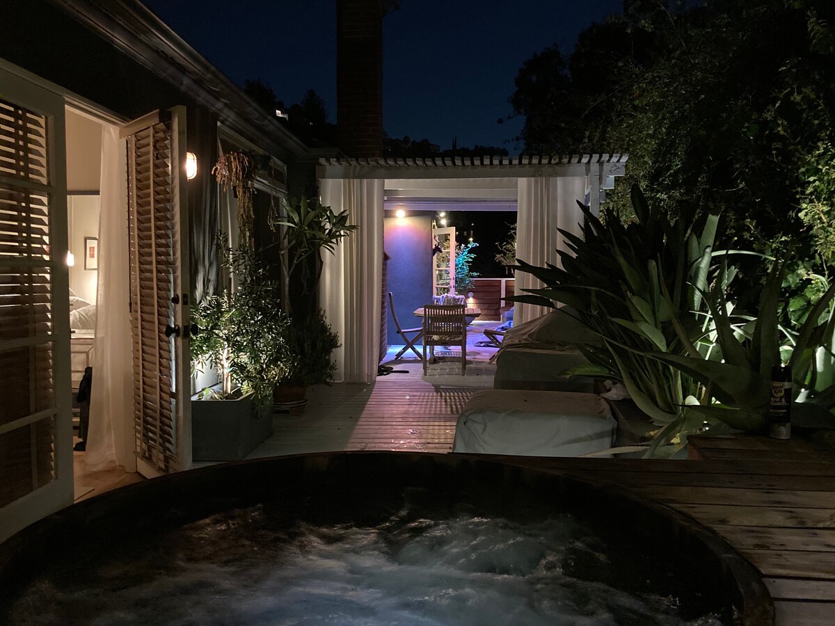 Retiro sereno, ubicado en Hollywood Hills; zen espiritual, oasis privado. Sensual y fresco con una influencia asiática/balinesa moderna, perfecta para el entretenimiento interior/exterior. Todos los baños ofrecen paz y relajación. Amplio dormitorio principal con chimenea y baño privado, bañera de inmersión y ducha de efecto lluvia. Relájate en el spa climatizado al aire libre. Este alojamiento evoca una respuesta emocional. Además, admitimos mascotas. Nuestro alojamiento solo tiene capacidad para 8 personas, no se permiten huéspedes o visitantes adicionales.