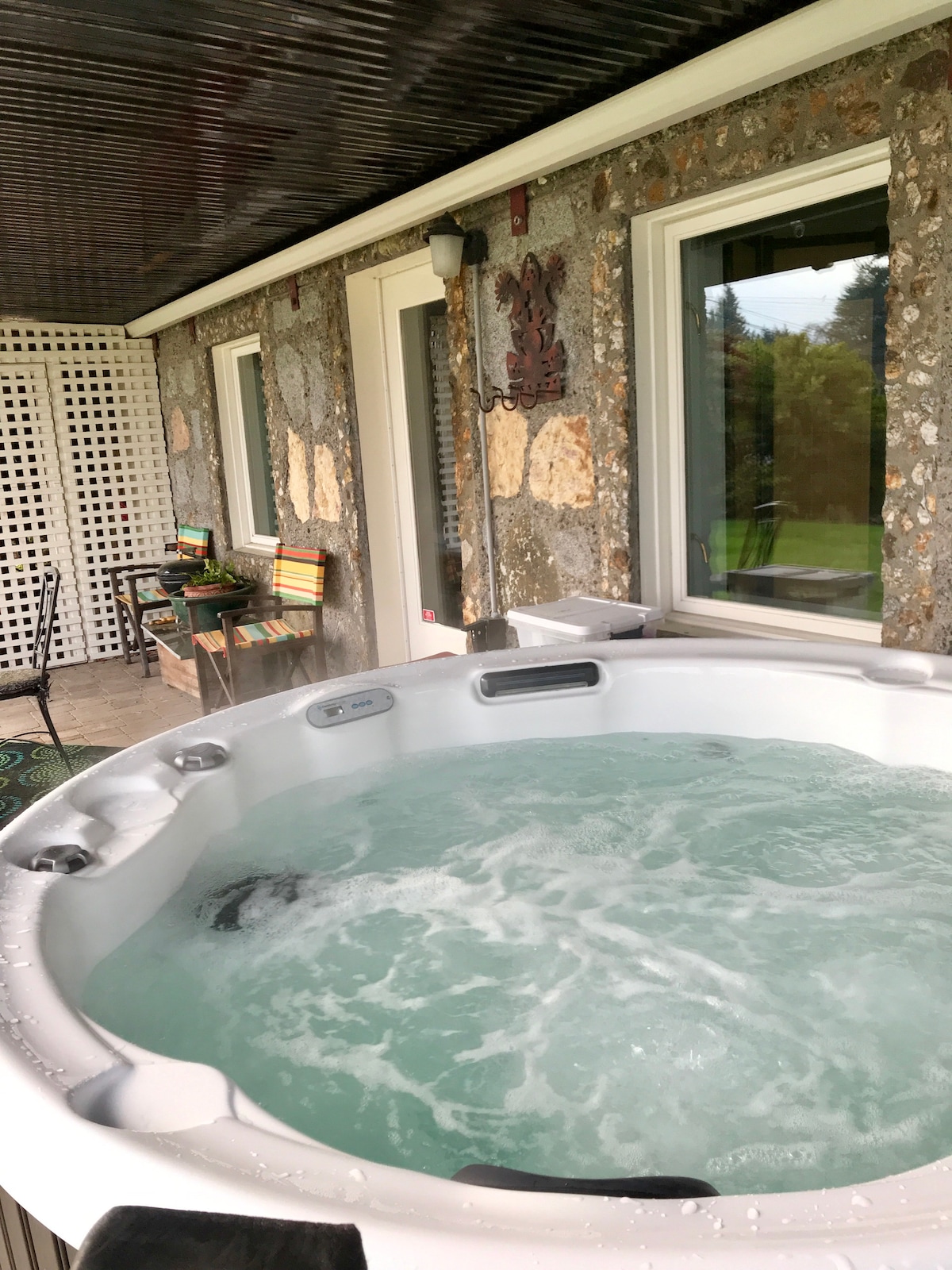 Estudio moderno con acceso a bañera de hidromasaje y cenador
