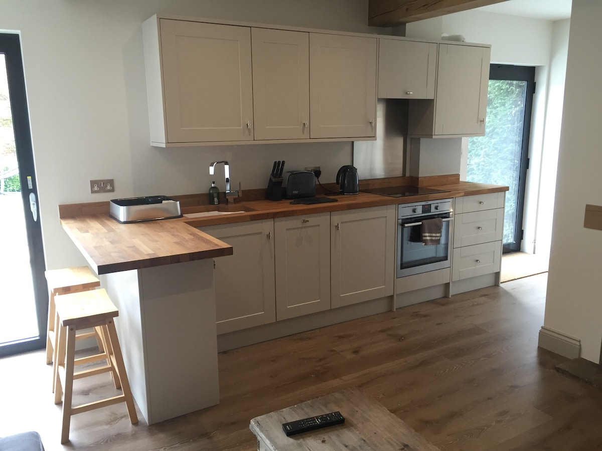 Un refugio tranquilo para dos en Leith Hill, en la campiña de Surrey Hills AONB. Separado y dentro de su propio jardín. Situado en una calle tranquila rodeada de campos con kilómetros de senderos y pistas de equitación. El granero se ha convertido y climatizado recientemente. Cuenta con una cama tamaño king y TV inteligente, baño con calefacción por suelo radiante y ducha a ras de suelo, cocina con utensilios de cocina, mesa y sofá. Desayuno de cortesía de cereales y zumo, café y té. Toallas incluidas. A poca distancia a pie del pub/restaurante local.