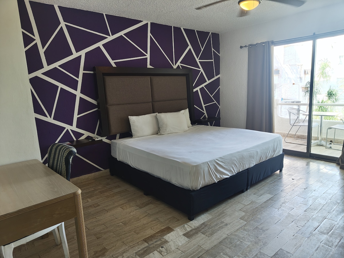 Nuestra suite cuenta con una cama king size, una sala, frigobar y comedor para dos personas, el hospedaje es solo para adultos, tome en cuenta que la ubicación está en el corazón de la zona de antros y se escucha el ambiente musical en la noche! Ya que está rodeado de clubes nocturnos! está a solo pocos pasos de coco bongo y la playa. Si tu plan de viaje es disfrutar de la fiesta este es lugar perfecto para ti. Tenemos personal las 24 horas del día.