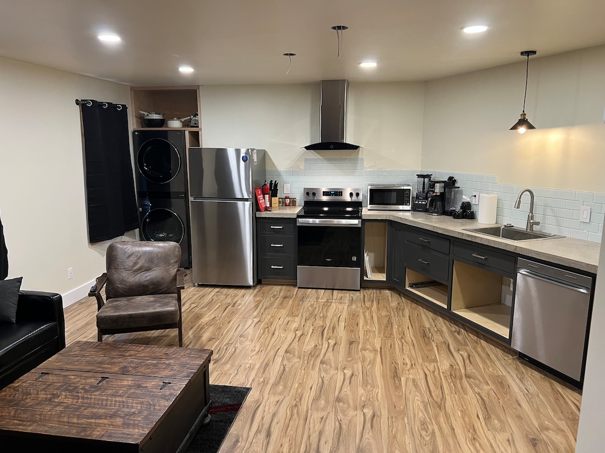 Un espacio de sala de exposición/sala de estar recientemente renovado convertido en un acogedor espacio de apartamento. Con una cocina moderna y baño con todas las comodidades que uno podría necesitar mientras visita nuestra hermosa zona. Con lavandería privada, cocina de tamaño completo y nevera de tamaño completo; ya sea que estés aquí por un día o por una semana, hay espacio para relajarse. Un baño espacioso con una gran ducha y lavabos para que la preparación para tu día sea fácil. Ubicado en el segundo piso sobre una futura zona de cafetería