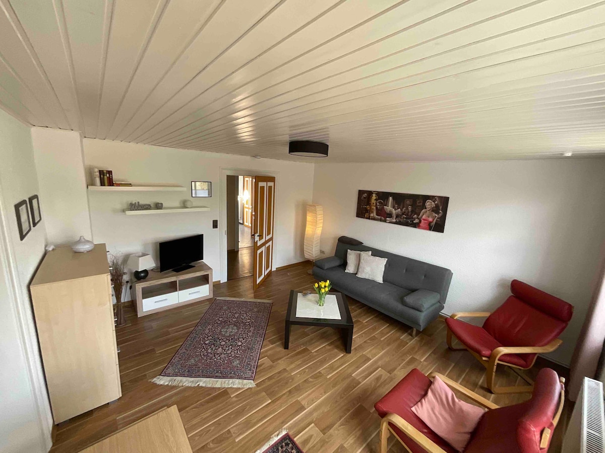En nuestra casa, el apartamento de la planta superior está libre para ustedes. Consta de 1,5 habitaciones más baño privado. Posibilidad de hacer café, microondas, nevera y TV en la habitación, así como un lugar de trabajo. No hay cargos adicionales. El gran jardín con posibilidad de hacer barbacoas se puede utilizar.