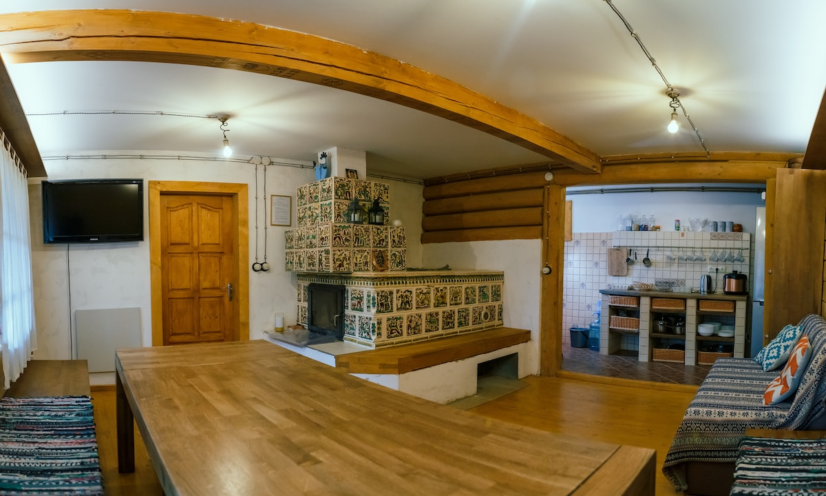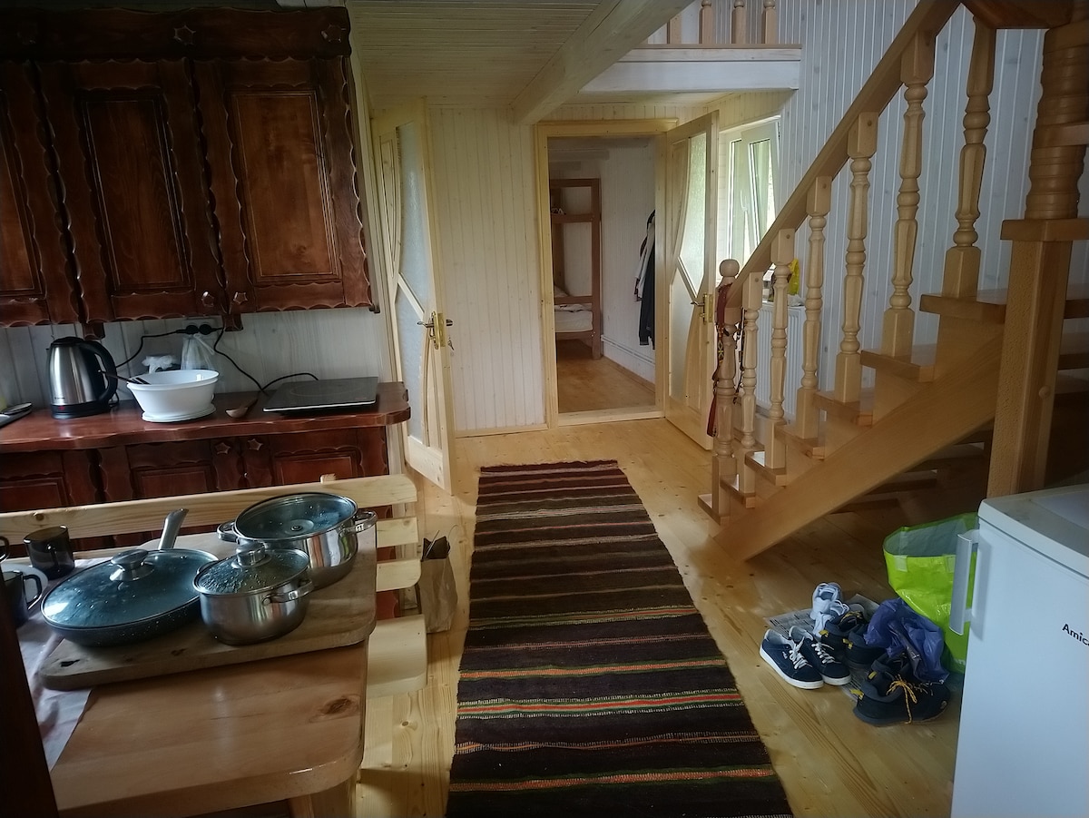 1-кімнатний дім з маленьким кухонним кутком (чайник, електрична плитка, мікрохвильовка, раковина з водою) і власним санвузлом. При бажанні господиня Вам приготує двічі на день такі смачні страви з гуцульської кухні, що пальчики оближеш. Господиня Настя здоїть Вам молочко прямісінько від корови, або по бажанню спробуйте здоїти корівку самі.