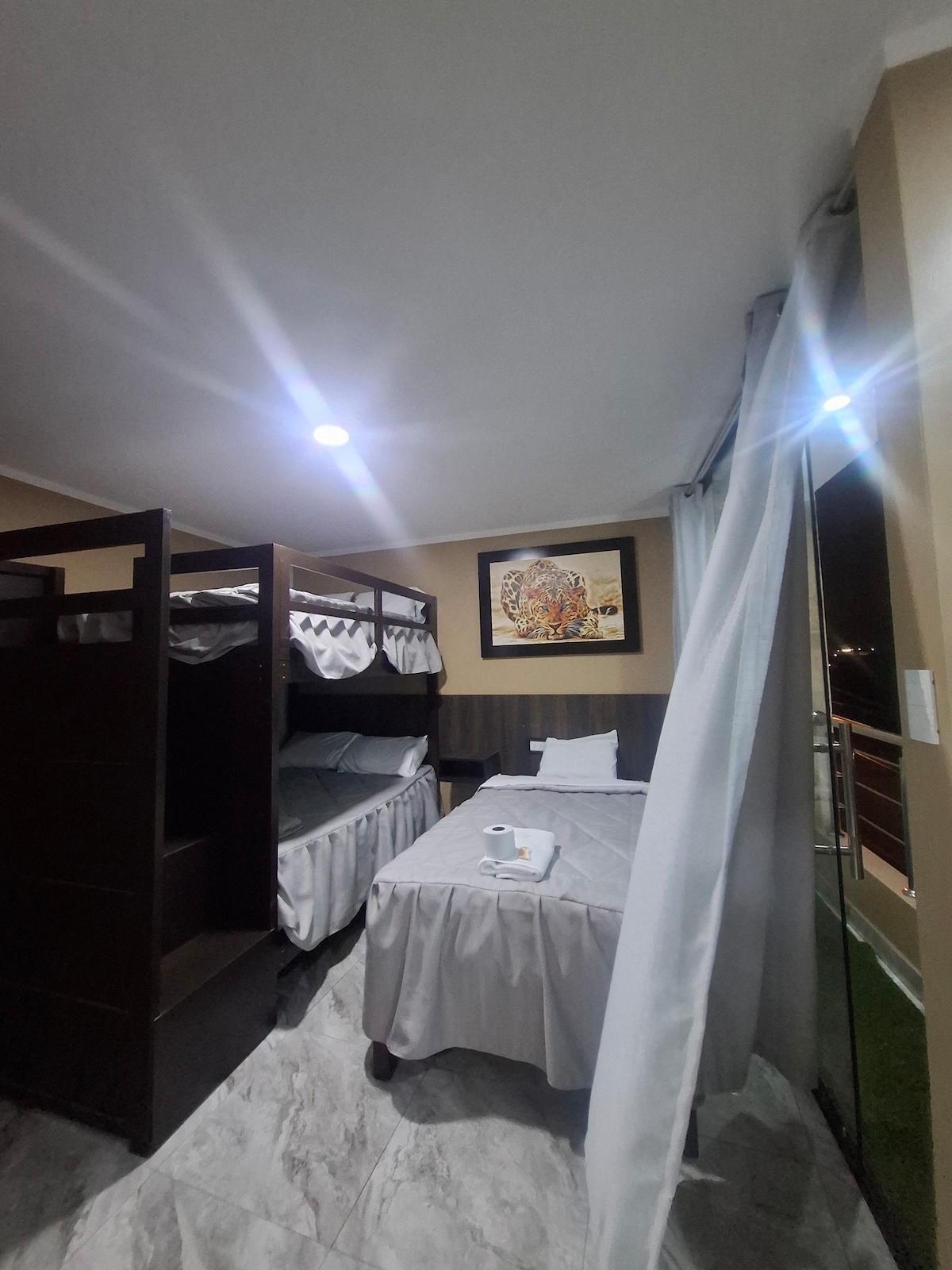 La habitación de la foto, puede tener hasta 3 personas, TV, WiFi, armario y baño privado, las atenciones son las de un hotel. El hotel se estrenó 2021. Es parte de un grupo hotelero con más de 20 años atendiendo familias, empresas y clientes corporativos. Ubicado en un zona residencial muy tranquila cerca al centro y a una cuadra de la avenida principal y 2 cuadras de la Panamericana Norte. Zonas comunes: 2 salas, una terraza con TV y kitchenette para compartir con amigos y una linda vista.