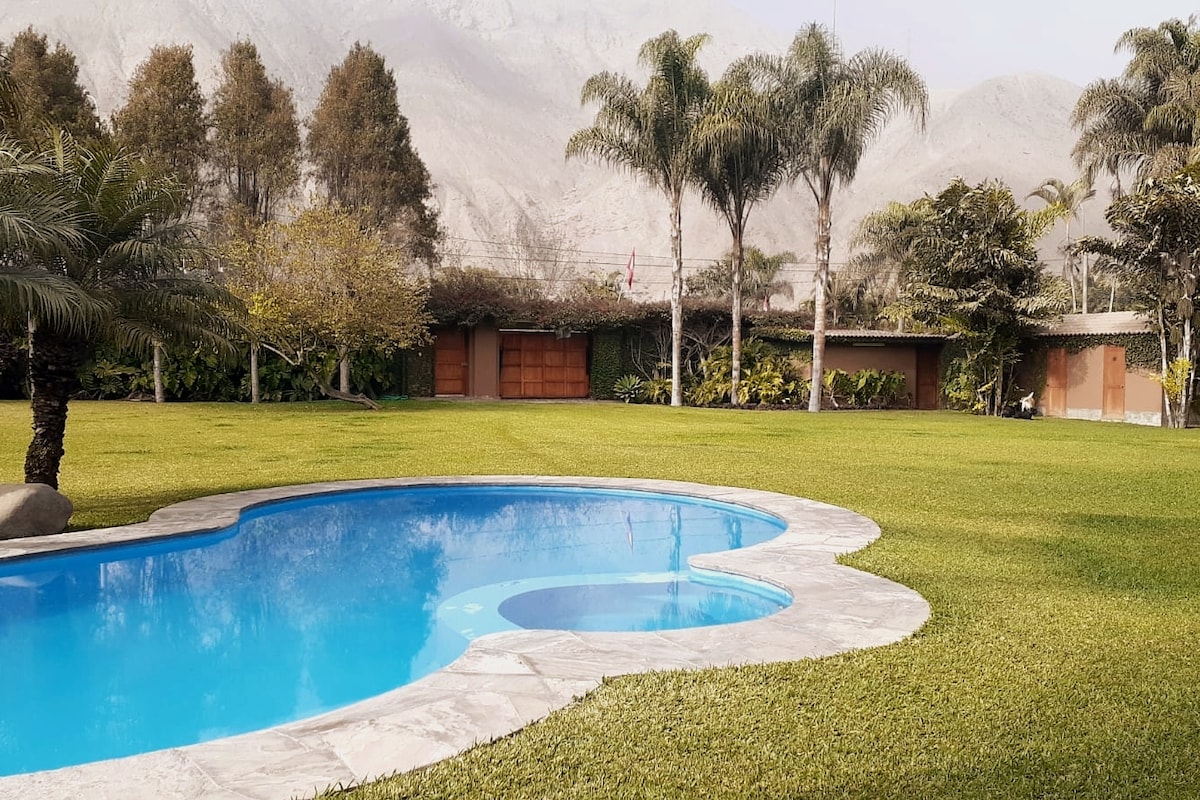 Escápate de la ciudad y disfruta de una experiencia única en nuestra acogedora casa de campo. Disfruta el mejor clima cerca de Lima, con sol todo el año. Piscina , jardín amplio , zona de parrilla y horno de barro. Ubicada en un condominio de solo 5 casas independientes. Espacios cómodos y ventilados. Cocina totalmente equipada. TV y WIFI de alta velocidad. Estacionamiento privado . Pet friendly. Perfecta para familias, parejas o grupos pequeños que buscan tranquilidad. Relájate en el campo!