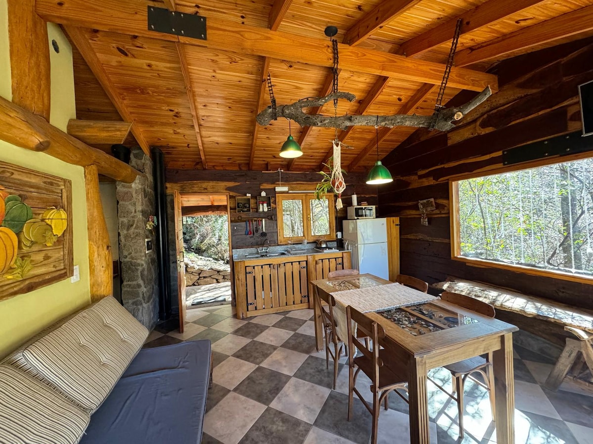 La casa cuenta con una excelente distribución. Dos plantas con 1 habitación en planta alta, con cama Queen y un amplio escritorio para trabajo remoto. Posee 1 baño completo con ducha escocesa con jets de alta presión. Un balcón con bellas vistas panorámicas a las sierras. Living con un sofá cama con hogar a leña. Cocina completamente equipada. También posee Deck exterior con vistas sobresalientes, bañera exterior, asador con parrilla, lavabo y un fogonero de piedra para disfrutar del jardín.