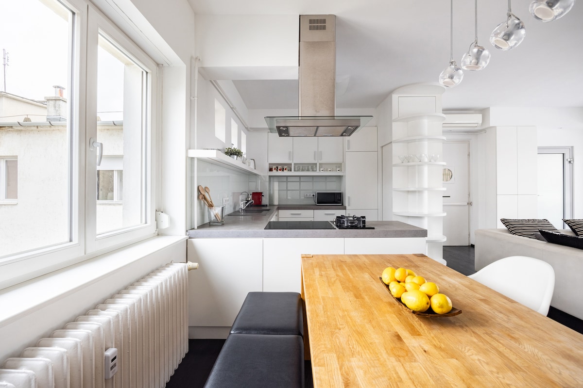 ●Apartamento de diseño recién reformado. ●Situado en el corazón de Budapest. ●SAUNA Wifi ●de alta velocidad. Aire ●acondicionado. ●ESPEJO en el techo sobre la cama tamaño queen. Aparcamiento ●SEGURO: 4 minutos. Tranvía y metro● 0-24: 1 min. Parada de autobús● DIRECTO AL AEROPUERTO (100E): 9 minutos.✈ Estación de tren● occidental: 1 min. ●Almacenamiento de equipaje: 4 minutos. Cocina con● todos los implementos Edificio ●SEGURO y CON CLASE en un distrito clásico de Budapest. ¡El ambiente● REAL de BP, ¡sé parte de él! ¡●NO ofrecemos alojamiento, ofrecemos hogares! ¡Estamos deseando recibirte! :) Thomas