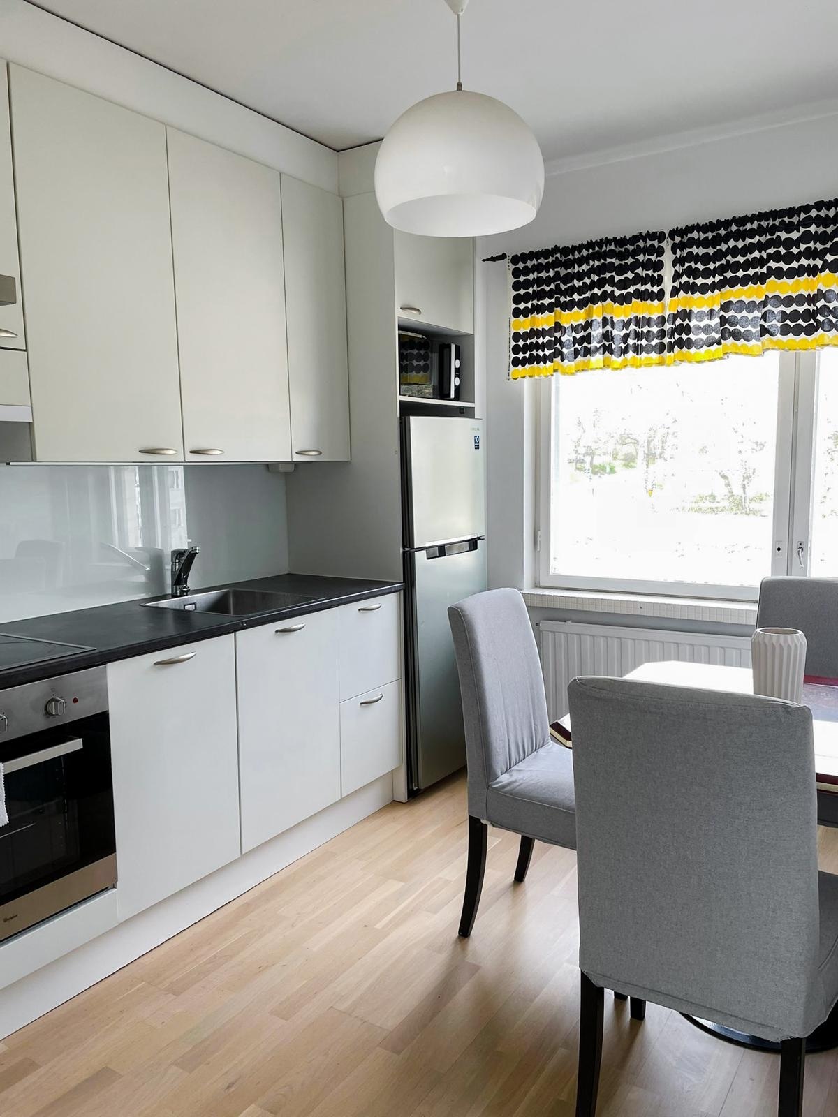 El apartamento ha sido renovado en la primavera de 2019 con una cocina completamente nueva y 1,5 baños. La cocina debe satisfacer las demandas de un buen cocinero casero. Los servicios básicos siempre están disponibles, intentaremos satisfacer las solicitudes adicionales. Netflix es de forma gratuita. El apartamento es el más adecuado para dos adultos, pero hay un sofá en la sala de estar que es espacioso y lo suficientemente cómodo como para dormir también. Se admiten mascotas entrenadas en la casa. Hay un balcón donde se permite fumar.