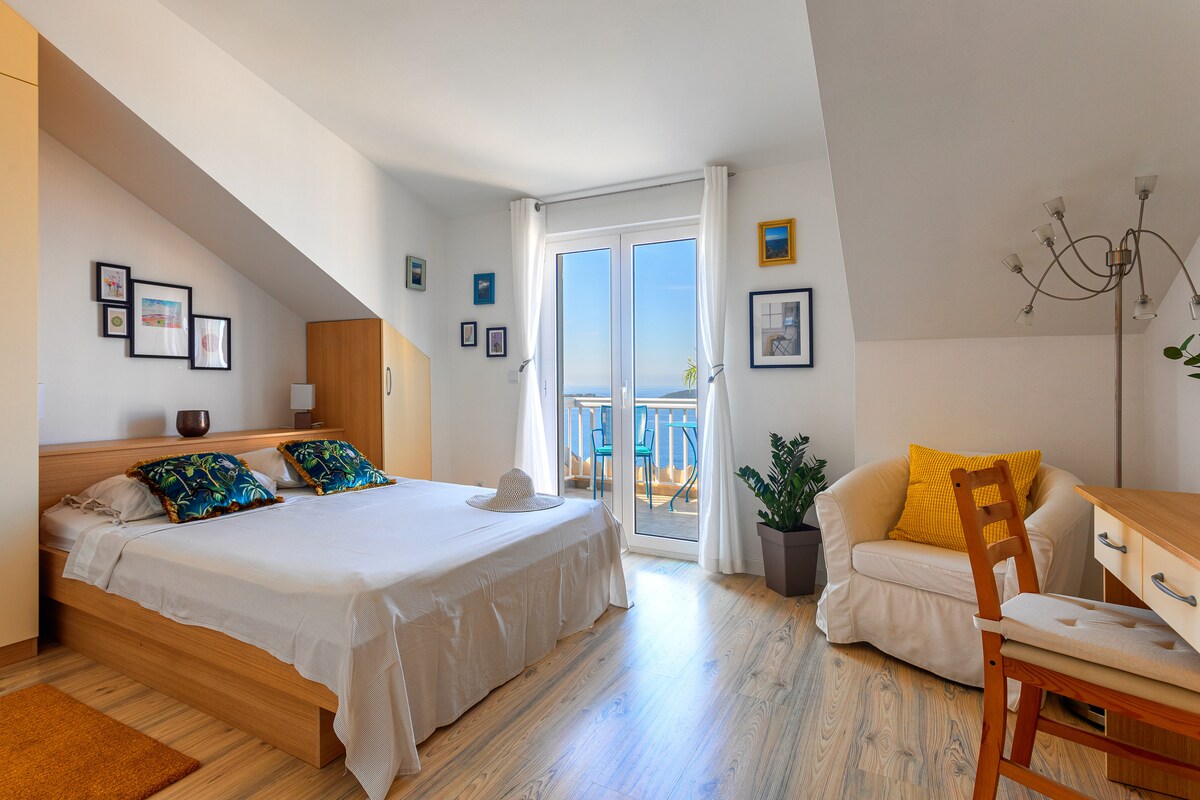 Estudio soleado con vistas parciales al mar en la ciudad de Hvar