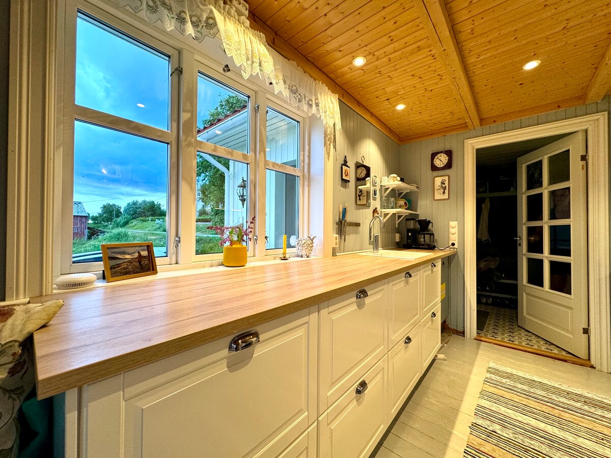 Solstadveien 24 está tranquilo en un entorno pintoresco, rodeado de bosques y campos, y vistas panorámicas al mar. La propiedad tiene un jardín grande y acogedor con una fogata. Hay una sala de jardín afuera, donde puedes sentarte y disfrutar de la vista incluso si llueve afuera. La sala del jardín está cerrada durante el invierno. Solstadveien 24 está situado en un entorno pintoresco, con vistas panorámicas. Hay un bonito jardín, con una chimenea exterior y una orangerie para uso en verano.