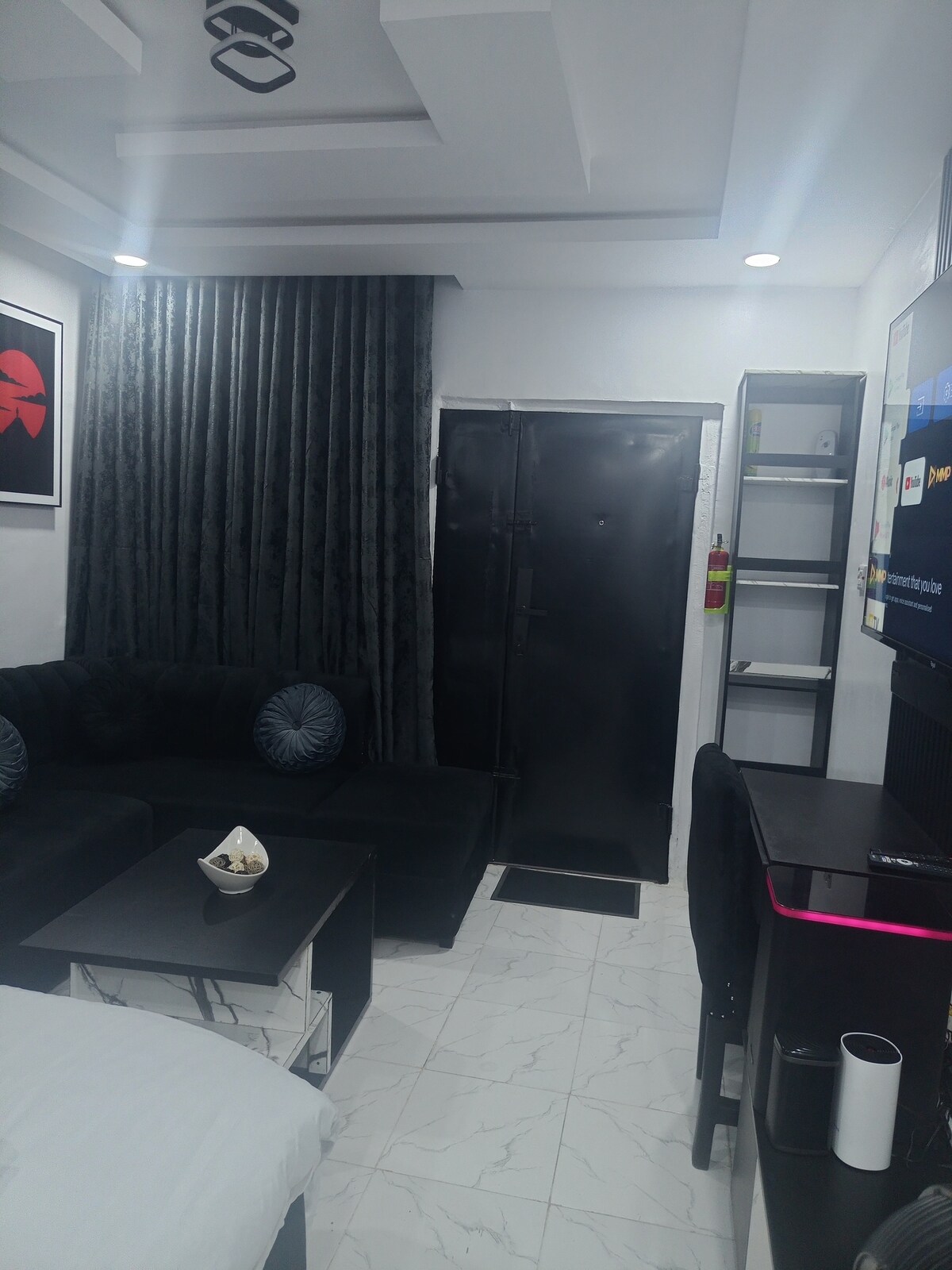 ¡Bienvenido a Studio Haven, un acogedor refugio urbano en el corazón de la ciudad! Este elegante apartamento tipo estudio combina la comodidad moderna con un ambiente cálido y acogedor. Disfruta de una lujosa cama, sábanas suaves y una cocina compacta pero totalmente equipada. La sala de estar cuenta con una televisión inteligente y conexión wifi gratuita, perfecta para relajarse o trabajar. A pocos pasos de vibrantes cafés, tiendas y transporte, este refugio ofrece la base perfecta para tu aventura en la ciudad en el corazón de Lekki fase 1