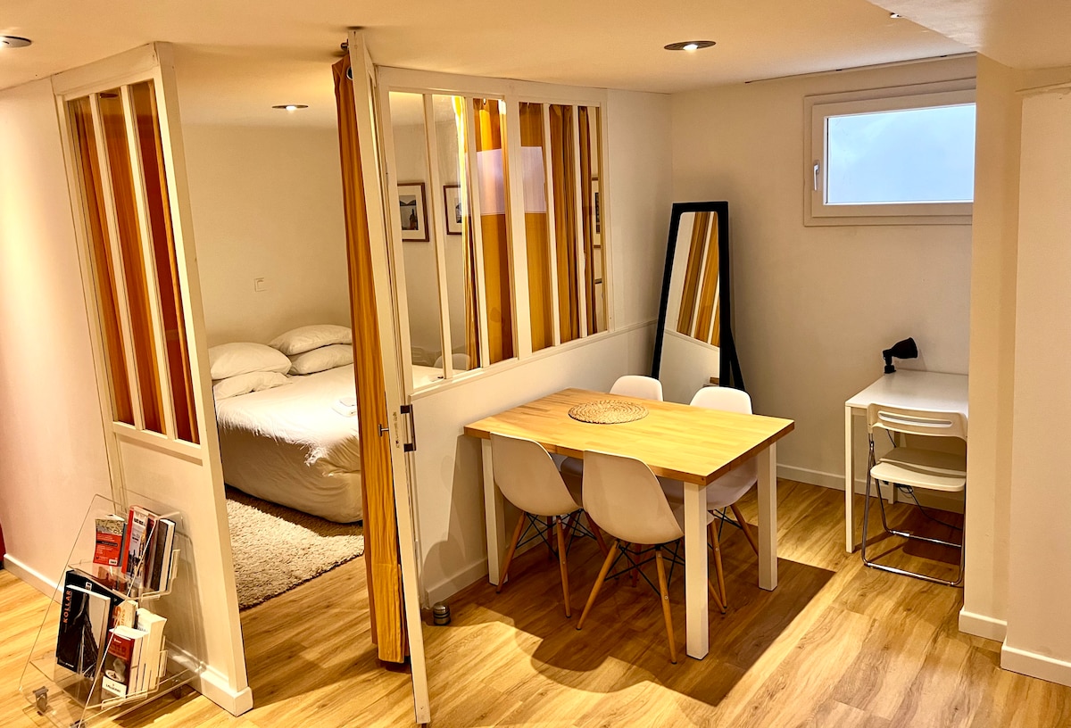 Estudio de una planta, de 24 m2, con una cama doble o dos camas individuales, con vistas al Sena, con una vista impresionante de París, ubicado en las alturas de Meudon Bellevue, en una entrada privada, con un jardín de 900 m². Cerca de tiendas, restaurantes y transporte (Metro 9 - Tranvía T2 - Línea de tren N - Autobús), a 25 minutos de la Torre Eiffel, estación de tren de Montparnasse a 12 minutos, Versalles a 12 minutos. Ruta en bicicleta a París. ¡Ideal para trabajar (wifi de alta velocidad) o relajarse!