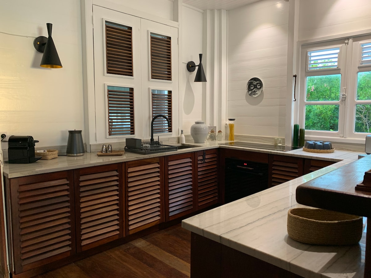 Disfrute del encantador entorno de este romántico alojamiento en plena naturaleza. Situada frente a la bahía de los Santos, considerada una de las más bellas del mundo. Esta cabaña criolla es ecológica, ya que es toda de madera y autónoma en agua y electricidad (agua de lluvia y electricidad solar). La ducha exterior a temperatura ambiente en un entorno vegetal le ofrecerá un cambio de aires garantizado. La cocina diseñada y amueblada con un espíritu criollo le traerá todo el equipamiento necesario para una estancia de ensueño.