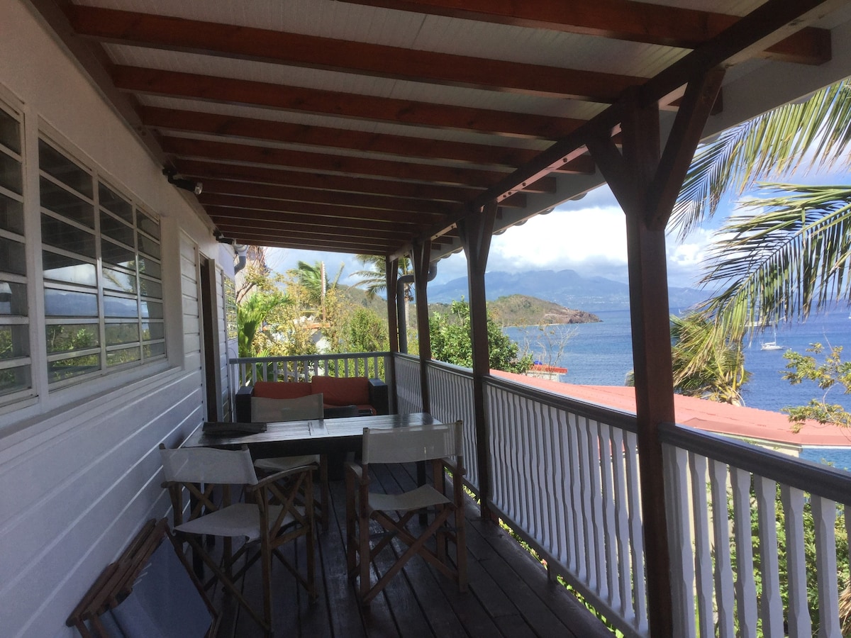 Terre de Haut alojamiento en el 1.º piso con vistas al mar independiente, salón con cocina americana bien equipada, baño con ducha e inodoro, 1 dormitorio con cama de 140, armario, sábanas, toallas, posibilidad de toalla de playa, cuna bajo petición. La casa se encuentra cerca del muelle, del centro, con todas las tiendas cerca, la oficina de turismo y las playas