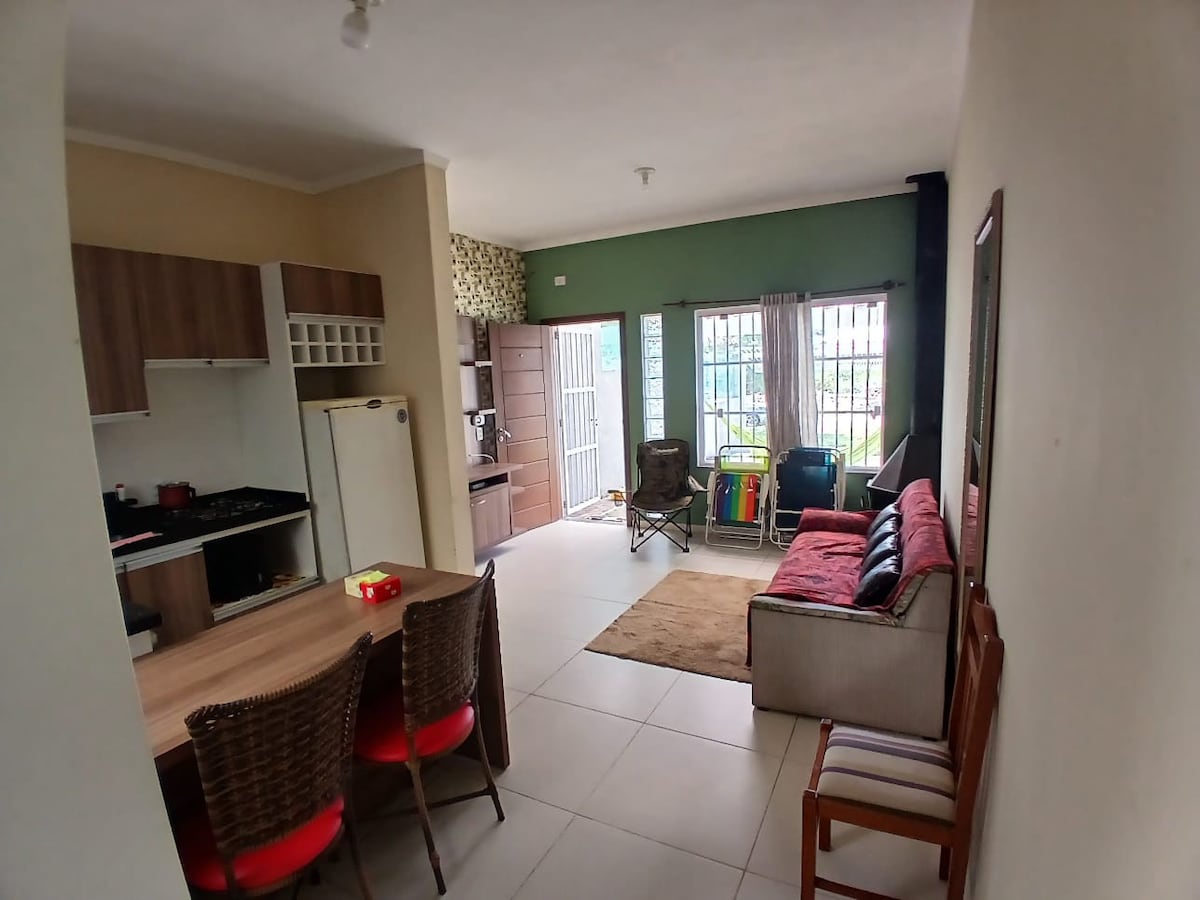 Espaço completo com vaga de garagem, 2 dormitórios mais sofá cama. localizada próximo da beira mar na guarita 128 fácil acesso. ambiente familiar completo com cozinha com talheres,pratos, geladeira, fogão e churrasqueira.