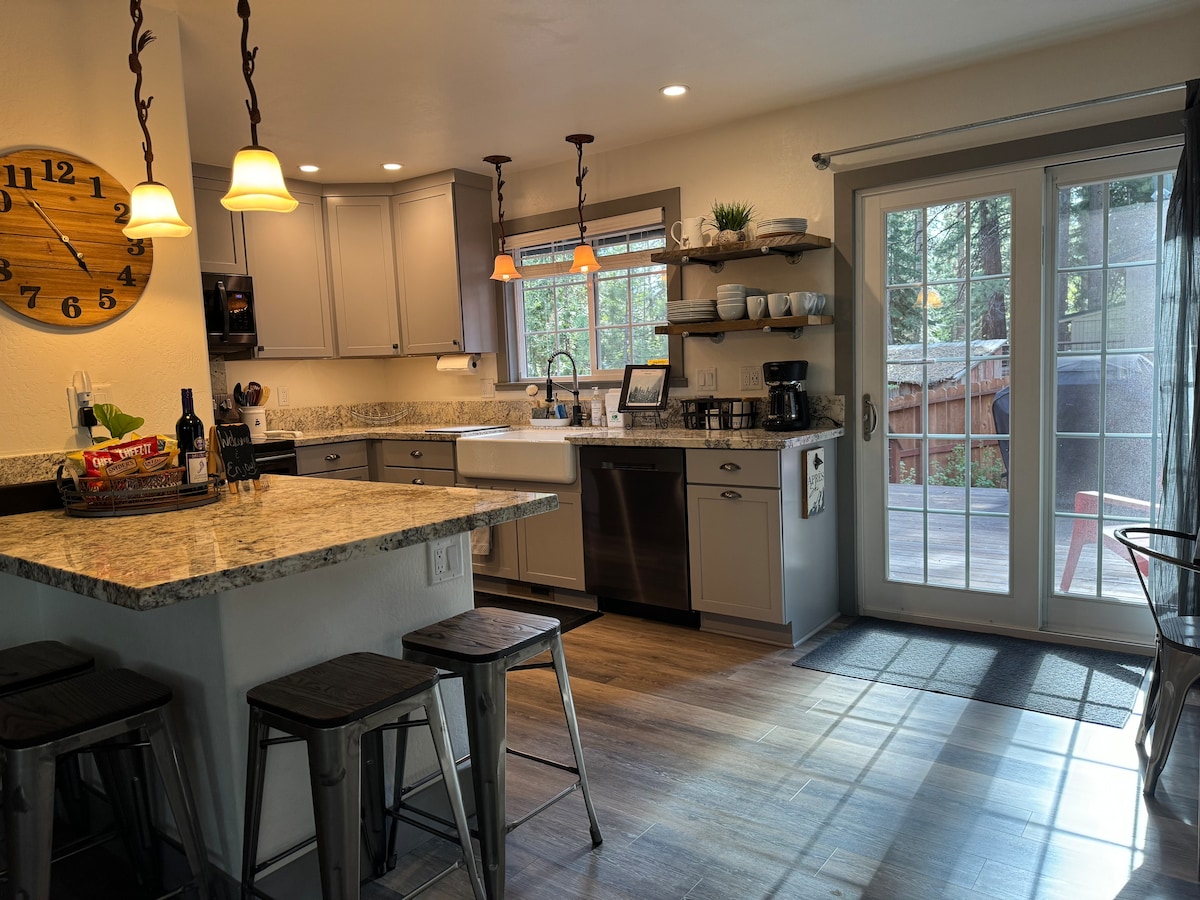 ¡Te ENCANTARÁ alojarte en esta cabaña de granja moderna/rústica recién renovada! Cocina gourmet, gran terraza al aire libre para el entretenimiento, un GARAJE con lavadora/secadora, una acogedora chimenea de gas, y todo a poca distancia a pie de: hermosas playas públicas de arena, campo de golf, restaurantes, cafeterías, senderismo/senderismo/ciclismo/pistas de esquí de fondo, un magnífico parque y una tienda de comestibles Safeway abierta las 24 horas. Kings Beach está a 2 minutos, Northstar Resort a solo 9 minutos, Truckee a 15 minutos y Squaw Valley y Alpine Meadows a 20 minutos.