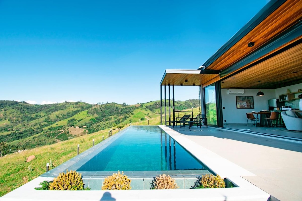 Escapada romántica en medio de la naturaleza, ideal para parejas. Chalet de estilo suizo (de estilo A) en un rancho rodeado de plantaciones de café, con un río privado y una cascada. Cuenta con bañeras al aire libre con vista a la Serra da Mantiqueira, un jacuzzi interior, una chimenea, una parrilla, una cancha de beach tennis, una cama columpio, una sauna seca con vista y un proyector interior con una pantalla de 100 pulgadas.