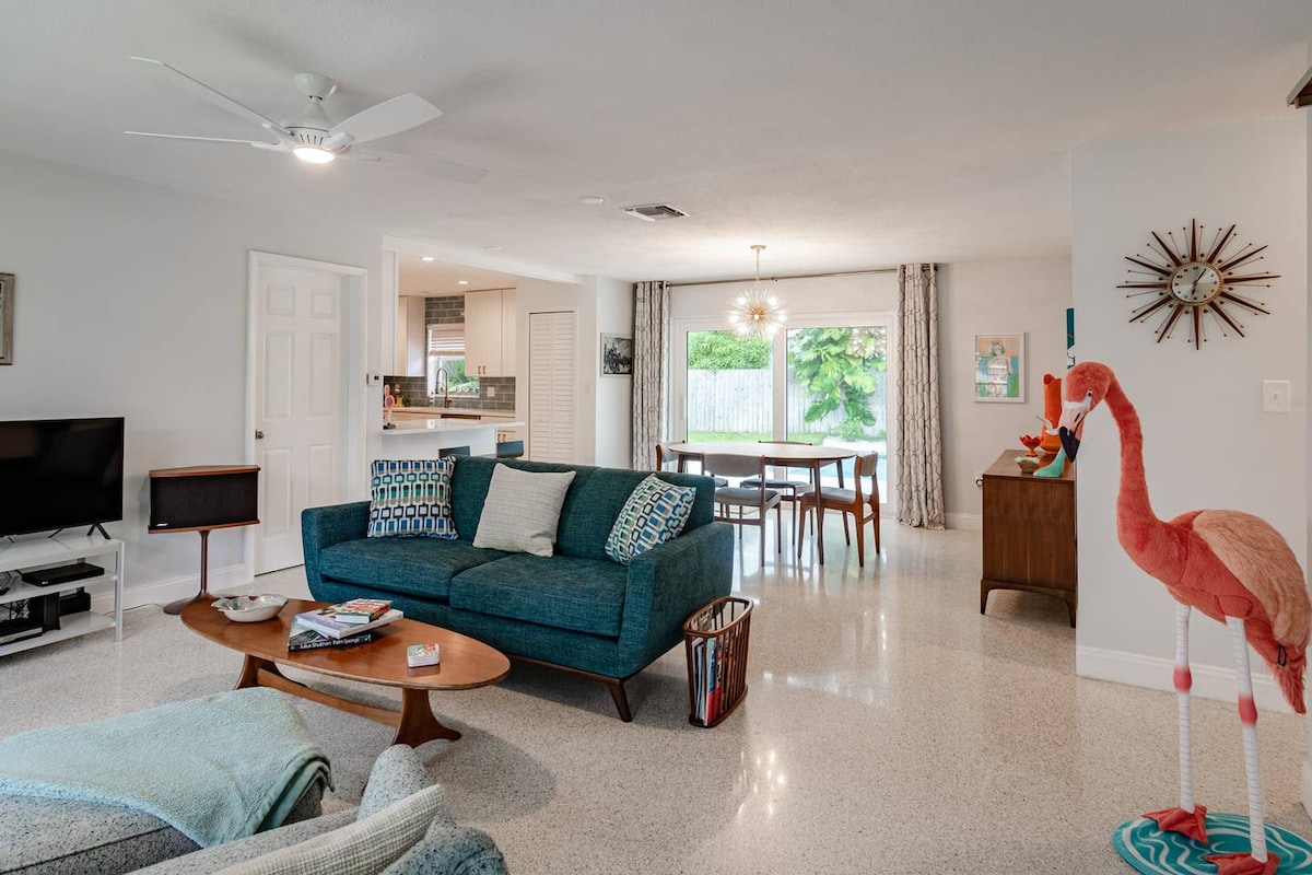 Spend your days soaking up the Florida sun, walking or biking to the beach. No need to pack your beach gear, we’ve got you covered. OR, lounge outside in the 40-foot saltwater pool in the lush, fenced backyard. The MCM fabulous Retro Chic 3BR, 2BA home is your quintessential beach-side home. Nestled in a quiet, family-friendly neighborhood, Indian Harbour Beach offers guests a haven from the more tourist-heavy areas, but within driving distance of all the Space Coast has to offer.