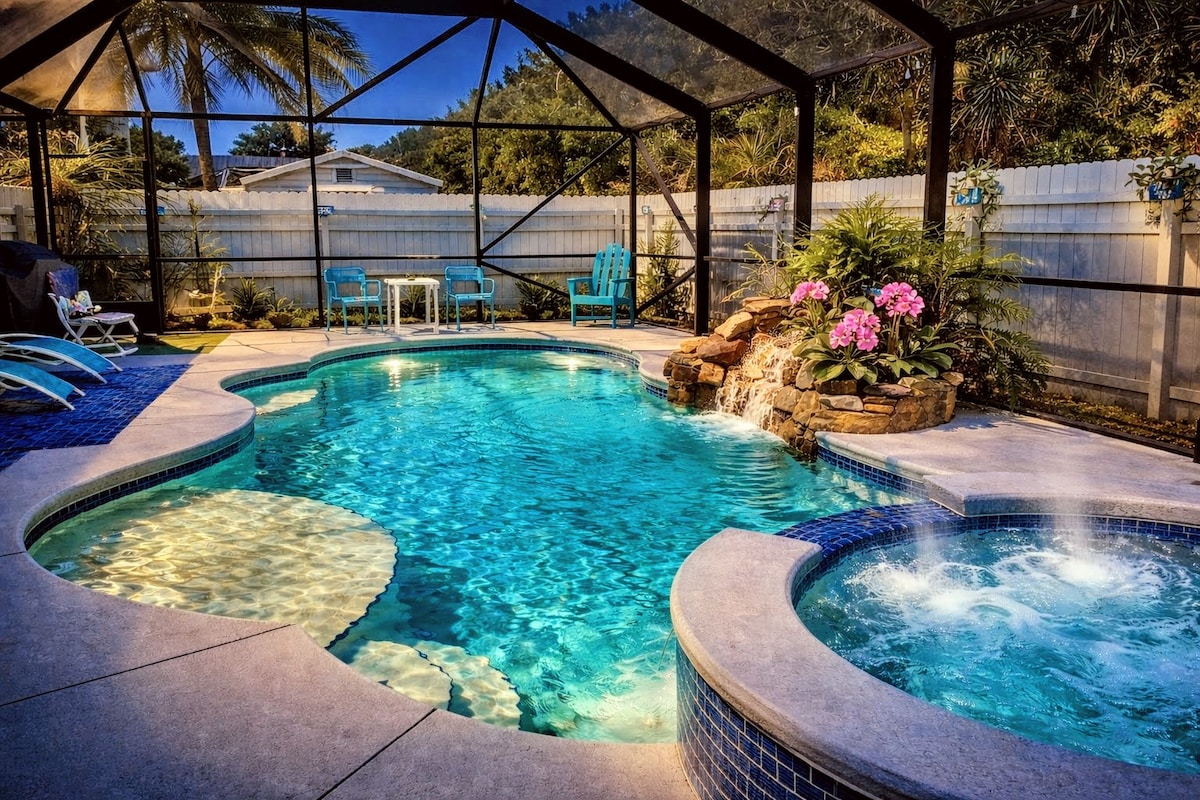 Disfruta de una estadía relajante en un alojamiento vacacional, perfectamente ubicado cerca de playas, del centro de la ciudad y de las principales atracciones locales. Ideal para familias, parejas o viajeros de negocios que buscan comodidad, privacidad y comodidades modernas. Lo más destacable 🏡 de la propiedad. ✔ 2 dormitorios ✔ Jacuzzi privado ✔ Parrilla y patio al aire libre ✔ Cocina totalmente equipada ✔ Aire acondicionado central 🌿 Zona privada al aire libre Relájate en tu propio oasis en el patio trasero. Sumérgete en el jacuzzi, cocina tus comidas favoritas o relájate bajo el cielo de Florida después de un día de playa.