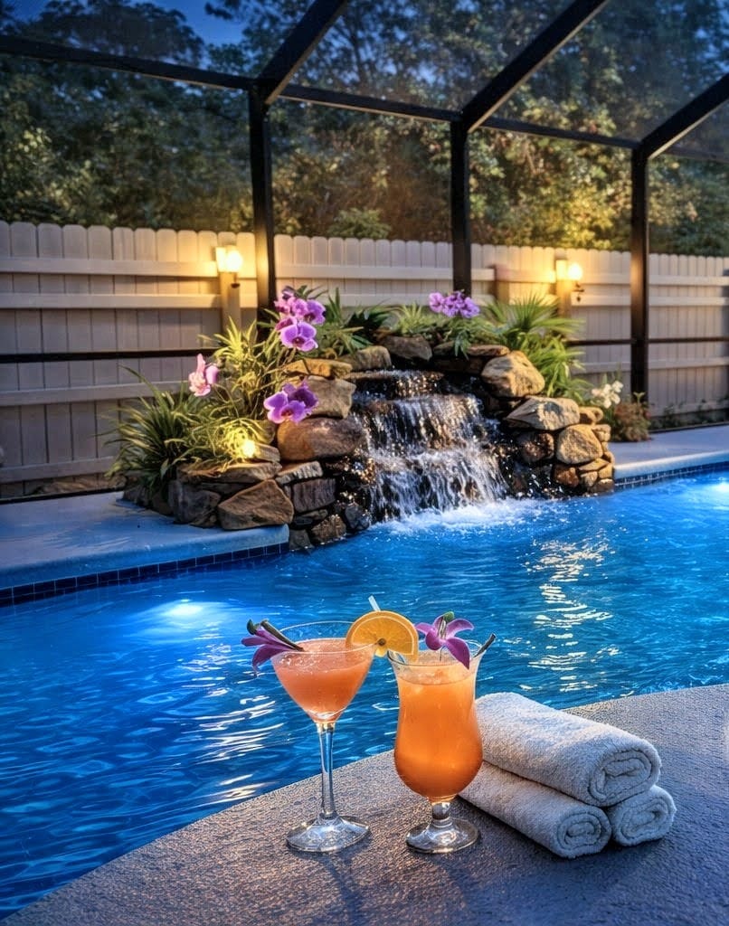 Bienvenido... al PATIO TRASERO COMPLETO de The Contemporary Cove para protegerte de los insectos de Florida. Sumérgete en el lujo con este impresionante oasis contemporáneo, diseñado para mezclar la elegancia moderna con tranquilidad serena mientras te sientes como en casa. Ubicado en un vecindario pintoresco, este alojamiento ofrece el mejor refugio para aquellos que buscan estilo, comodidad y relajación. Piscina estilo resort: pieza central resplandeciente rodeada de un patio extragrande, sala de estar al aire libre y chimenea, perfecta para noches entretenidas o tranquilas.