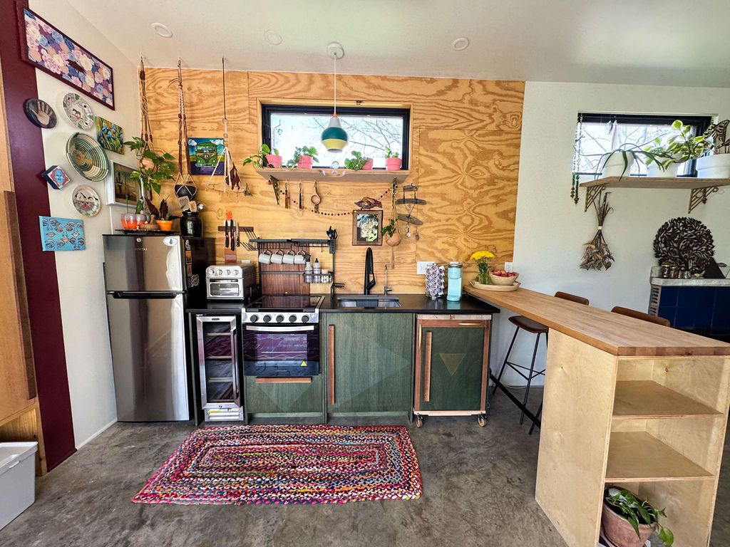 "The Zion" es una moderna casa de contenedores temática bohemia con tonos terrosos, decoración verbal y arte animal. Es una de las tres casas de contenedores ubicadas en el lote. La casa se compone de 7 contenedores de envío con un invernadero adicional y una terraza en la azotea. Las ventanas del piso al techo en el primer y segundo piso dan a ambos una perspectiva única del río Fall Creek. La terraza de la azotea ofrece una vista del horizonte de la ciudad, así como vistas panorámicas del río, los puentes cercanos y el dosel verde.
