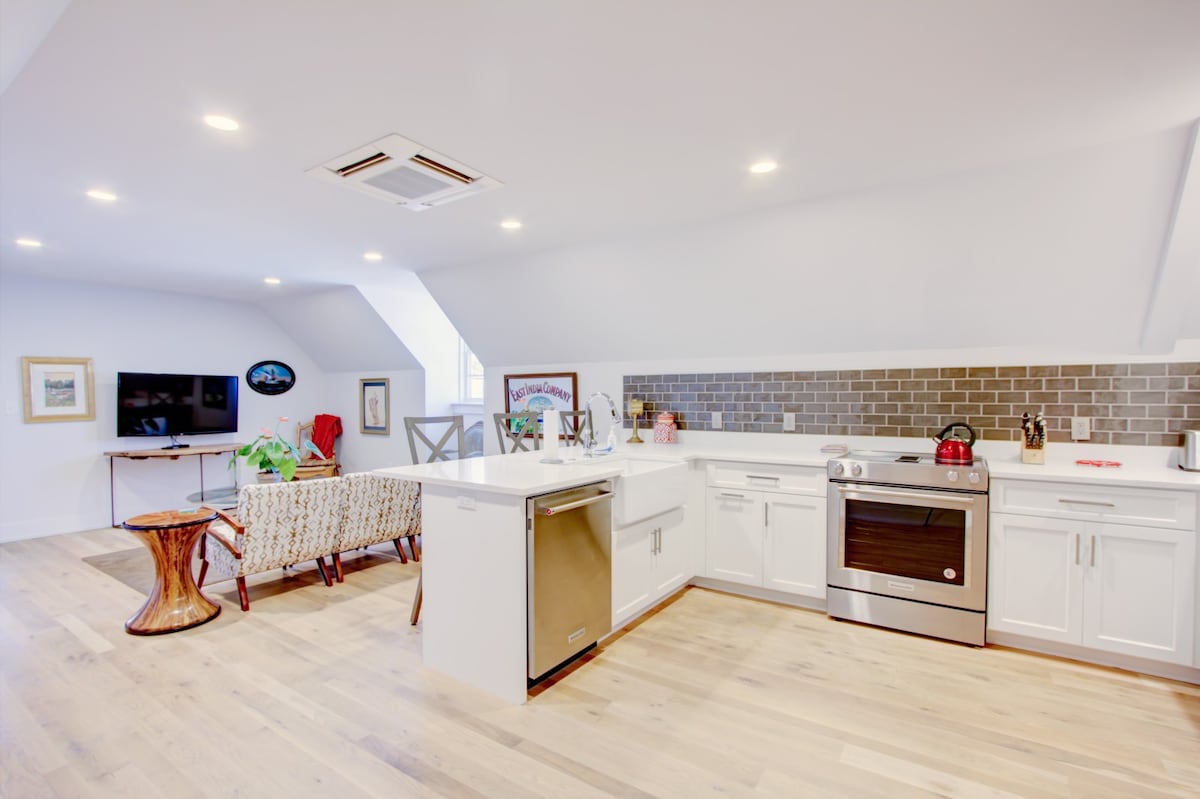 Precioso apartamento, espacio privado. Comedor y sala de estar abiertos y amplios. Cocina bien equipada: nevera, cocina/horno completo, microondas, tostadora, licuadora, cafeteras, ollas, sartenes, platos, utensilios. Productos para preparar el desayuno a mano. Sala multimedia con TV inteligente, asientos cómodos, estación de trabajo con ordenador. Dormitorio principal grande y espacioso con cama tamaño king o se puede cambiar por dos individuales. El baño se encuentra junto al dormitorio, ducha a ras de suelo, sin bañera. Playas, el centro de Wilmington, UNCW, todo a 15 minutos en coche.