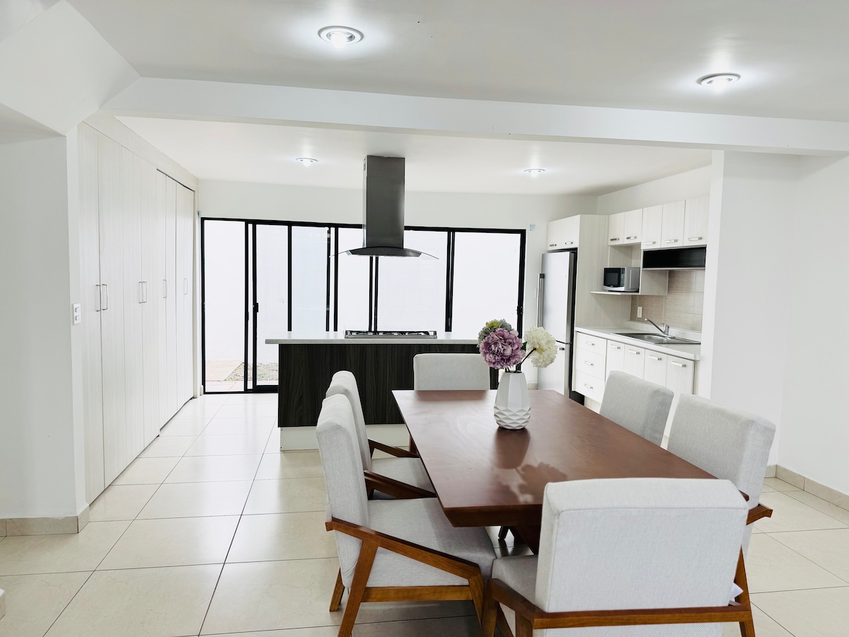 Casa con grandes espacios, 3 habitaciones, 2.5 baños y capacidad para 8 huéspedes, espacio para estacionamiento. En zona súper comunicada (salida a León). A menos de 10 minutos de los mejores sitios de la ciudad: plazas comerciales (Plaza Cibeles), supermercados (La Comer, HEB, Walmart), parques industriales (Castro del Río, Apolo), zonas recreativas (Centro de la ciudad, parque Irekua); y a menos de 30 mins del Aeropuerto Internacional Bajío.