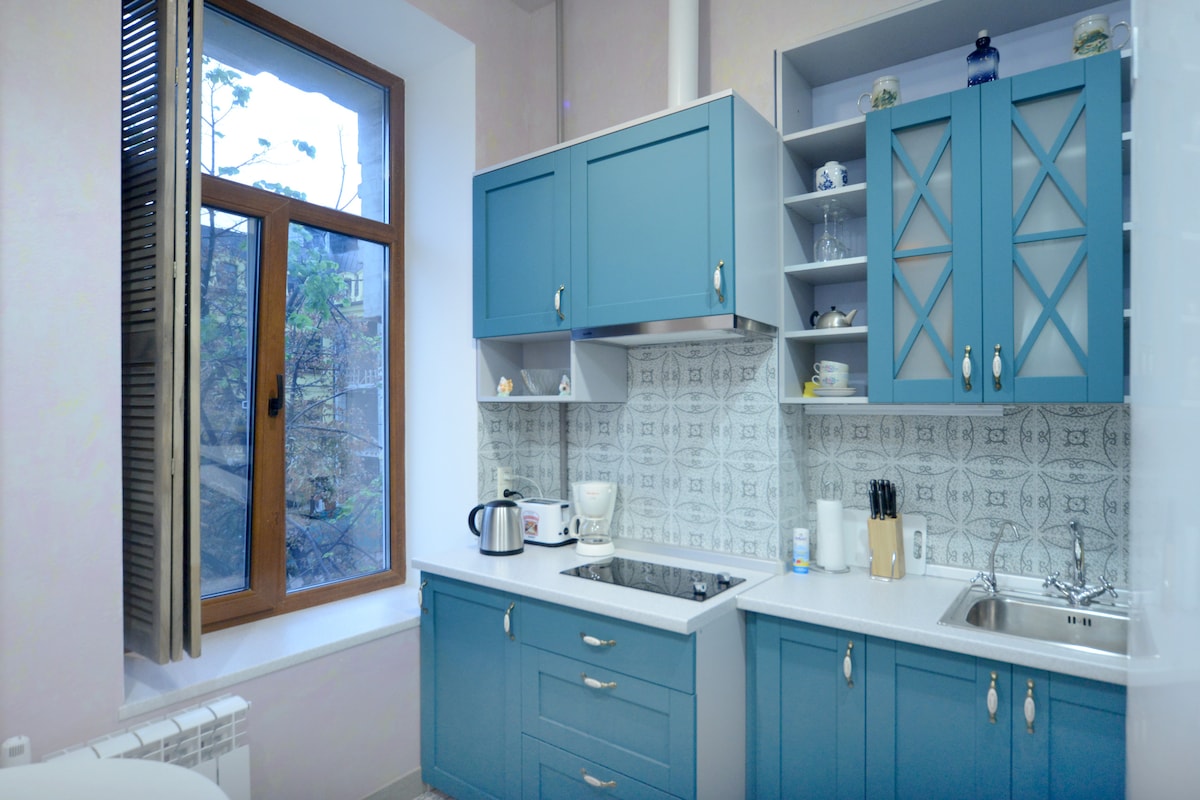 ** El wifi (1 gb/seg) sigue funcionando durante los apagones hasta 10 horas. Apartamento de 1 dormitorio y sala de estar muy bien decorado en el corazón del distrito histórico. Ubicado en un edificio prerrevolucionario, acaba de ser completamente renovado en 2016 según los estándares occidentales. Está a un minuto a pie de la plaza Kontraktova y el Montmartre de Kiev, el descenso de San Andrés con innumerables restaurantes y cafeterías.