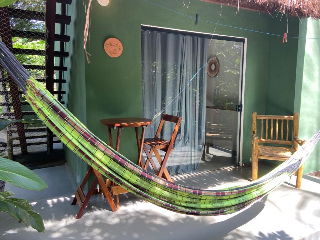 Chalé para casal com frigobar, ventilador de teto e outro comum, situado ao calmo, na natureza, a 8 km de Itacaré, longe do barulho da cidade e de fácil acesso, tem piscina e estacionamento privado, seguro com portão eletrônico e área externa segura. O lugar é muito privilegiado por sua tranquilidade e a natureza ao redor que dá um charme especial além de ser localizado perto das praias mais lindas da cidade, jeribucaçu, engenhoca, hawaizinho e itacarezinho.