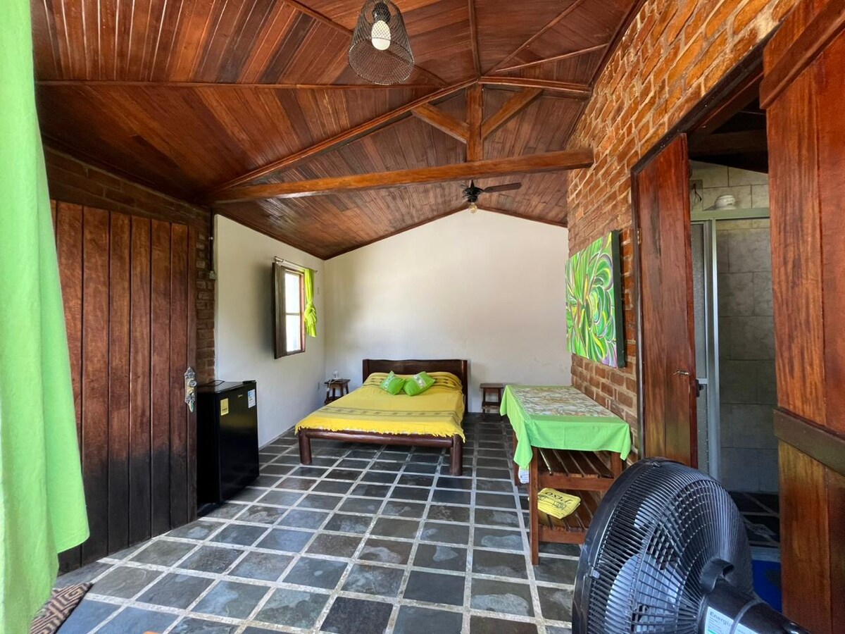 Deléitate con esta encantadora suite de 18 m², un refugio de tranquilidad y bienestar en medio de la naturaleza. Tiene una cama tamaño queen con mosquitera, aire acondicionado, iluminación natural y un balcón con hamaca. Decoración rústica y hecha a mano, creada por el propietario, y espacio de trabajo con buena conexión a internet. La cocina al aire libre está equipada, incluida la barbacoa. Sostenible, con calefacción solar y separación de residuos, así como una ducha externa para una mayor comodidad después de la playa.