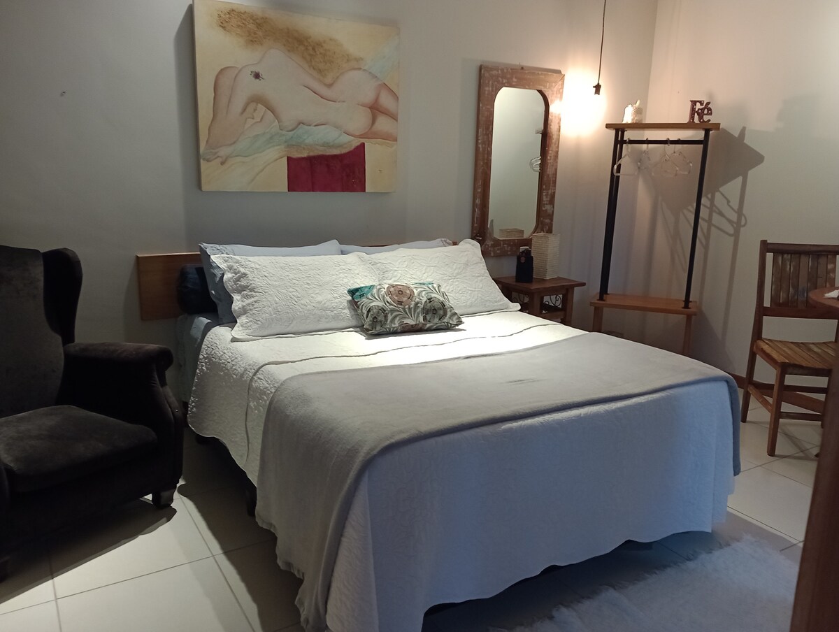 Alojamiento cómodo con aire acondicionado, TV inteligente de 50" con TV por cable y Netflix, ventilador de techo, perchero, baño, cocina con cocina americana de dos hornillas (prohibido freír), minibar, microondas, sandwichera, licuadora y accesorios, a 10 minutos a pie de la playa más hermosa de Niterói, bocadillos, bares, mercado, farmacia y más; paseos en bicicleta, senderismo, caminatas y surf (Itacoatiara forma parte del circuito internacional y nacional de bodyboard y olas grandes). No se permite fumar dentro de la suite.