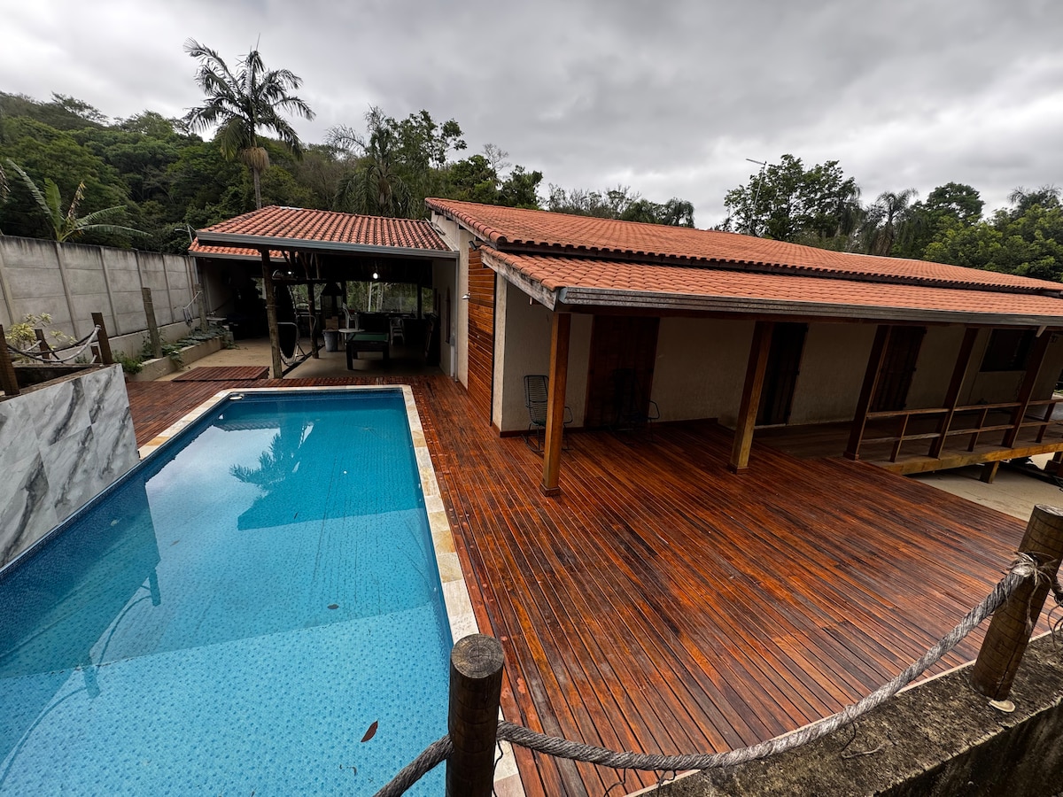 1.400m², cercada por muito verde, casa c/ 3 dorms, sendo 01 suíte externa, 2 banheiros, sala confortável c/ lareira, cozinha completa, cama p/ 8 pessoas 02 varandas c/ belíssima vista p/o verde, churrasqueira, piscina c/ chuveirão, pomar, jardim .