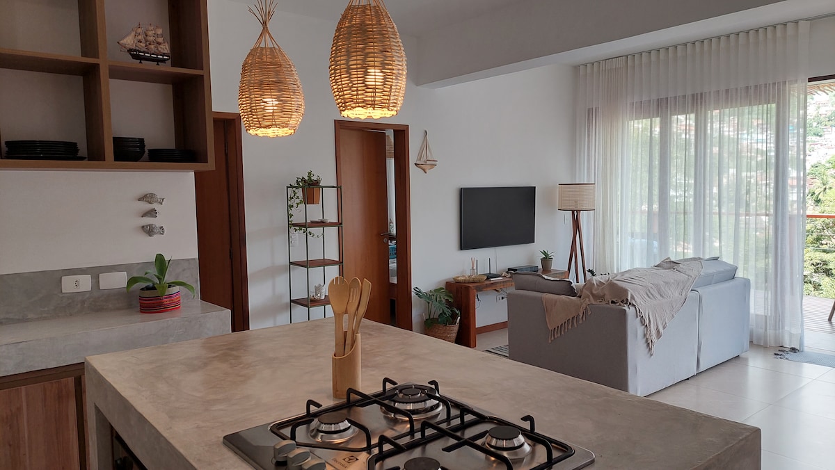 Espacio nuevo, tranquilo y encantador. Suite con cama queen, luces de lectura y ropa de cama perfumada. Una cocina con filtro de agua, encimera de dos hornillas y utensilios para preparar comidas. Balcón muy agradable, con mesa, hamaca cómoda y piscina a pocos pasos de distancia. Todo hecho con cariño para recibir a personas de buen gusto en busca de tranquilidad. La serenata está a cargo de la sinfonía de la Mata Atlántica de Ilhabela, una de las islas más bellas de la costa brasileña.