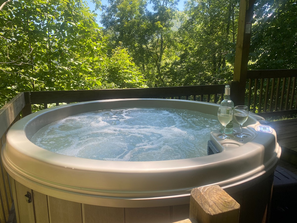 Cabaña Luv'n Mt'n, bañera de hidromasaje bajo la cabaña, golosinas de bienvenida