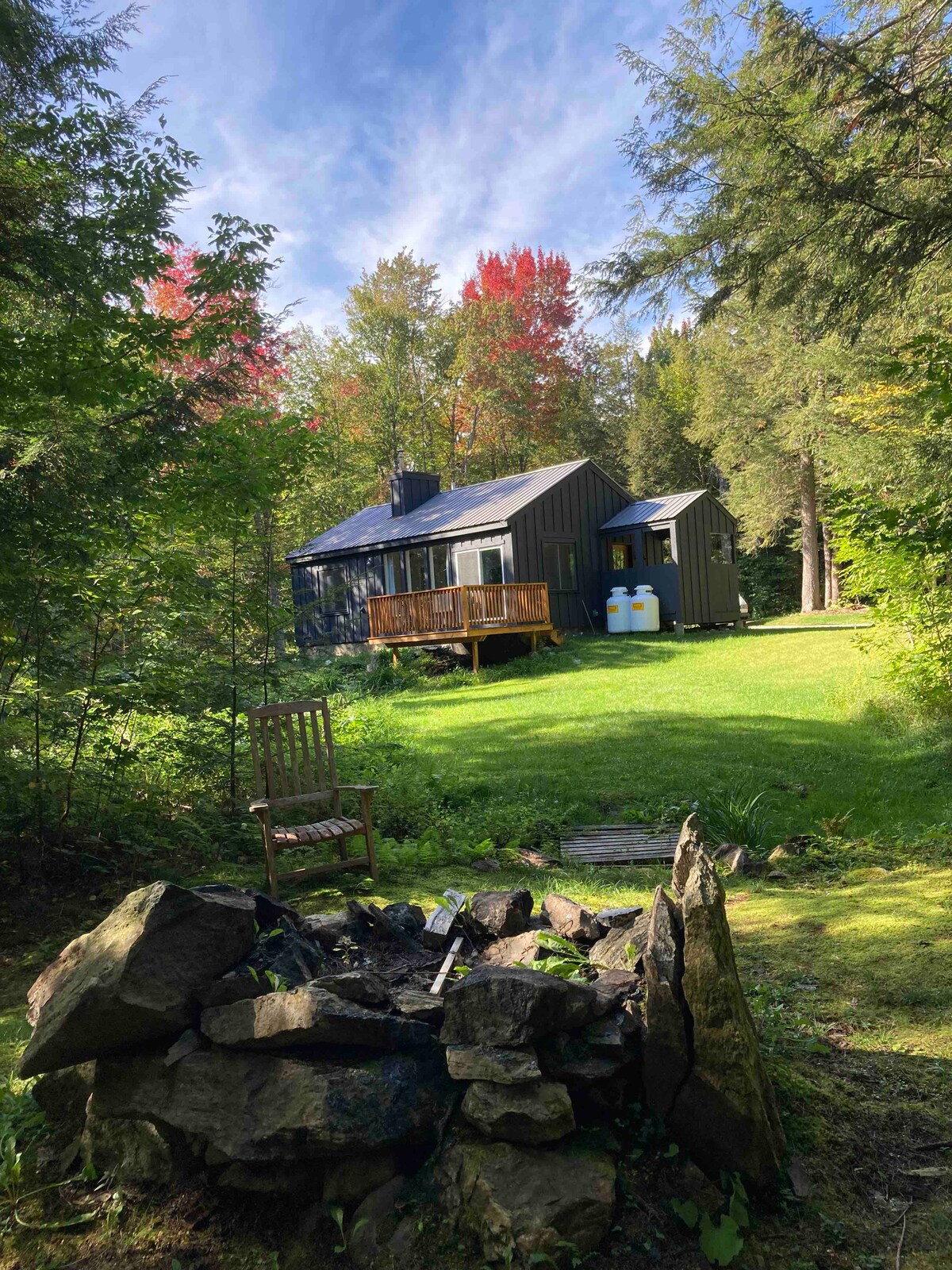A 7 minutos en coche del pickleball, el tenis, la piscina, el golf, el ciclismo de montaña y el esquí en Stratton Resort. Disfruta de 13 acres de vistas arbóreas desde tu chalet privado. Lleno de luz con exposición sur. Cubierta y fogata para observar las estrellas, muebles modernos de mediados de siglo, electrodomésticos nuevos y wifi de 300 Mbps y un Mini Split AC/Heat. Cómodo para zonas de esquí, restaurantes, tiendas y piscinas, pero aislado y tranquilo. Caminata a Pikes Falls A 29 minutos de Bromley y Mt Snow Se requiere AWD para primavera/invierno. Tarifa por mascota 187 $.