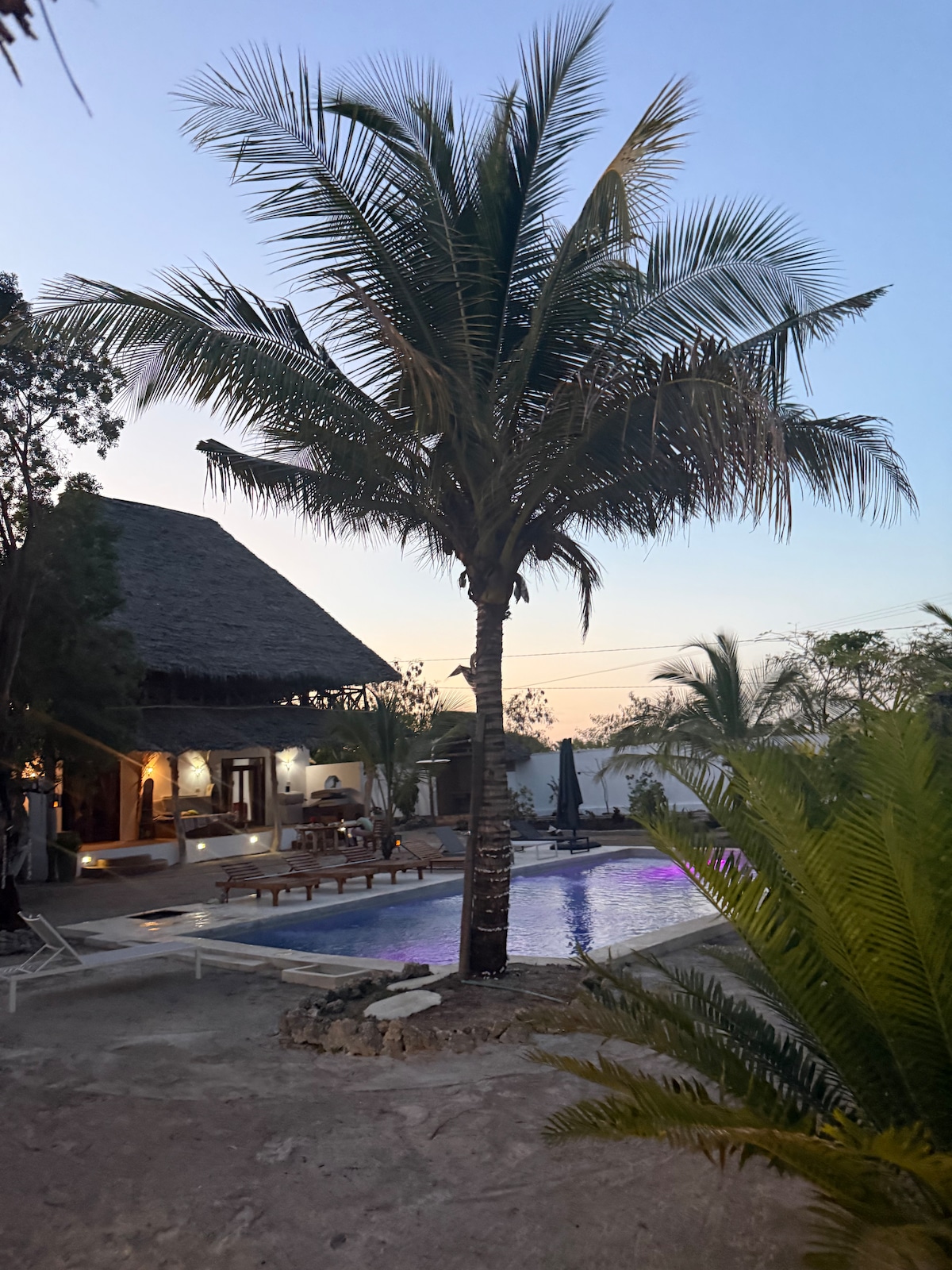 Tenemos una hermosa casa en Bwejuu . La casa está en primera línea , tenemos piscina privada. Además, hay 3 piscinas grandes y un restaurante. La casa es grande: 2 dormitorios 2 baños 3 toilletes Sala de estar y cocina (La cocina está equipada con horno, nevera,platos,cubiertos, licuadora, etc. 2 terrazas Aire acondicionado Generador ( cuando el generador está funcionando, tienes agua, luz, refrigerador, ventiladores de techo y nevera,wifi y enchufe de carga) . El deco de estilo africano está en la casa