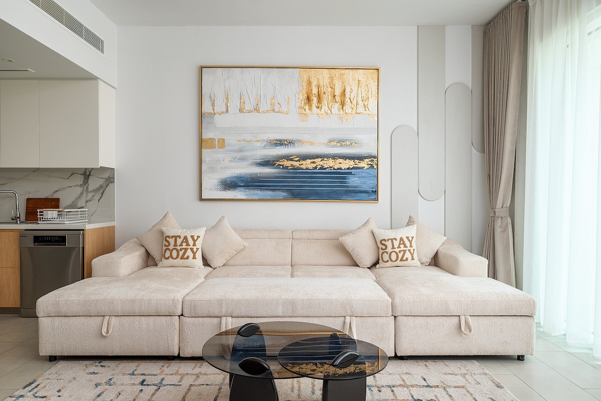 ¡Deléitate con el encanto de Bluewaters Island! Disfruta de la tranquila aura de The Wharf, disfruta de la tranquila aura de The Wharf, disfruta de la realeza en el Palacio de Caesars e incluso se codea con 60 celebridades realistas en Madame Tussauds. ¿Tu oasis personal? Un elegante apartamento de 1 dormitorio con vistas al mar, WiFi confiable y estacionamiento que es más fácil que un paseo mágico en la alfombra. Date un chapuzón refrescante en la piscina, esculpa tus aspiraciones en el gimnasio o pasea por el parque de la plaza como un explorador urbano.