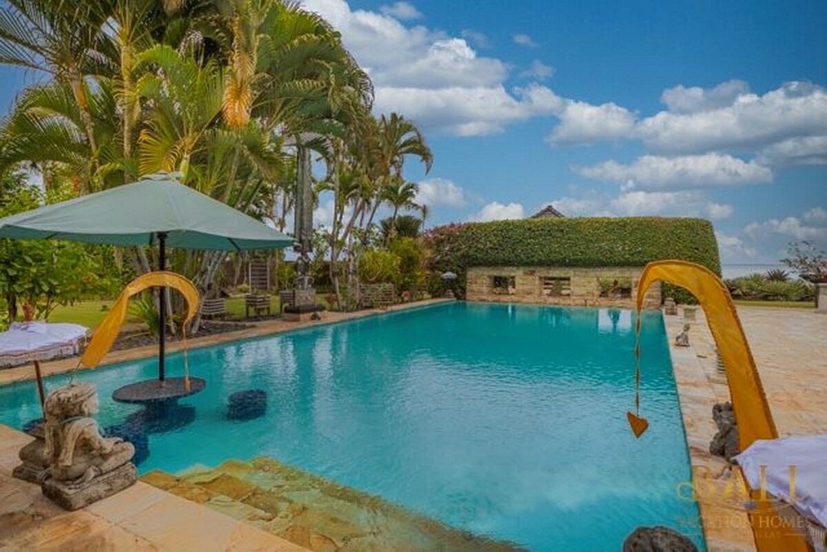 Villa Palmeira: Spacious, luxury, fully equipped & staffed villa set in 4,000m² of lush gardens facing the sea. 18m infinity pool, jacuzzi, bales & water features. 40m beachfront. Modern kitchen, indoor-outdoor living areas. 8 a/c bedrooms with private ensuite bathrooms. 4 bedrooms convert to library, studio, gym & sea view lounge. Chef, maid, houseboy, 3 gardeners & night security. 250Mbps wifi, 2 Smart TVs, Netflix. Lovina 25 mins. Car & driver. CHSE certified. Managed by RAF-Hauz®
