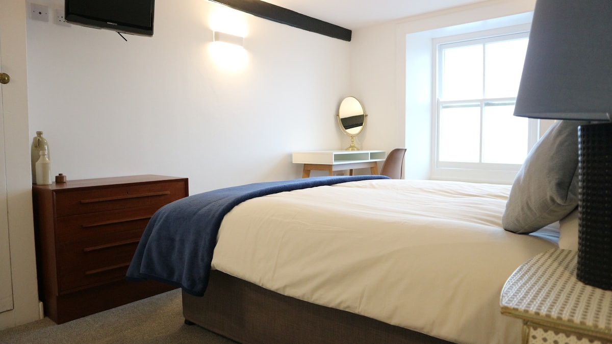Más una suite que una habitación con baño. Ubicado en el último piso de una hermosa casa adosada de St Aubins (segundo piso). Área generosa, cama tamaño king (colchón de espuma viscoelástica), baño en suite, gran zona de ducha, vestidor, amplio espacio para colgar y cajones. Vistas a la bahía. Mesa en la habitación para el desayuno, secador de pelo, hervidor de agua, nevera, máquina de té y café y toallas de playa. Zona de jardín con mesa y sillas. Espacio interior para bicicletas. El acceso es a través de una escalera estrecha ligeramente más empinada de lo normal. Para reservar 1 noche, envía una consulta.