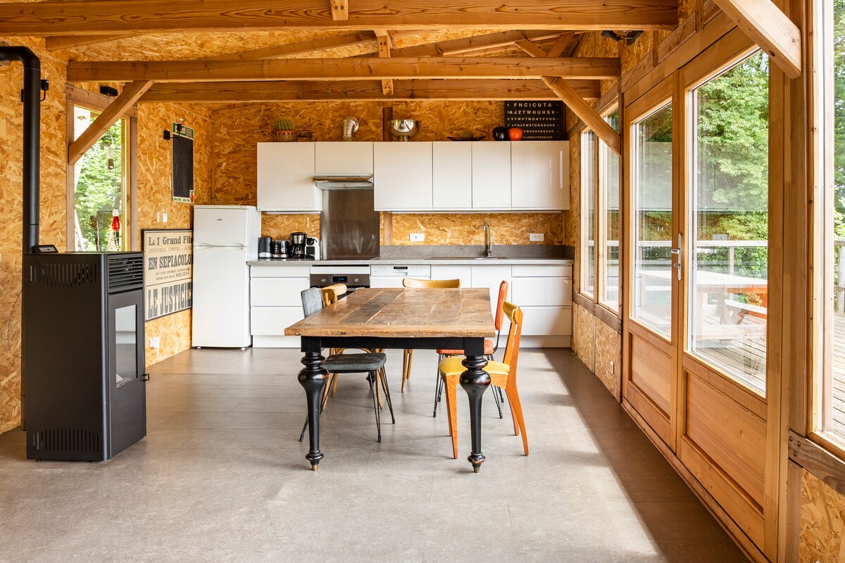 Cerca de Vittel con vistas a la llanura y al macizo de los Vosgos, cabaña sobre pilotes para compartir en pareja. Situada en una gran propiedad, tranquila, disfrutará de la comodidad de una cama grande y un baño con ducha de verano e invierno. El desayuno está incluido. Al lado de su cabaña, conectada por una pasarela, disfrute de la cantinetta. Es un espacio de cocina, lounge totalmente equipado para cocinar, compartir, relajarse... Este espacio es común a todos los huéspedes.
