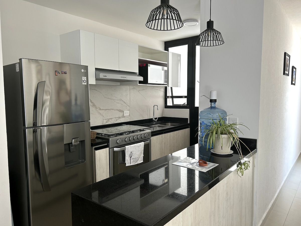 Ven y disfruta tu estancia en la bella ciudad de Aguascalientes con nosotros. Departamento muy bonito, céntrico con interiores modernos, el espacio cuenta con cocina, comedor, 2 recamaras bastante cómodas,amplias y acogedoras, 2 baños completos, cochera privada para 1 auto.