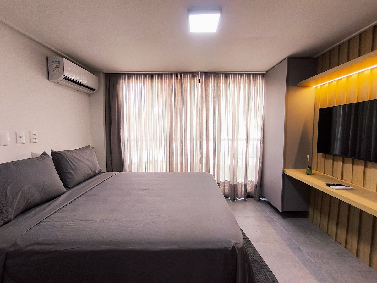 ¡Tenga un pedazo de paraíso a sus pies! Loft nuevo, recién amueblado, frente al mar de Bessa, perfecto para familias pequeñas (hasta 3 personas) o para viajeros individuales. Está dividido de la siguiente manera: ocio privado con jacuzzi y vista al mar privilegiada, suite doble con smart TV 50' y estación de trabajo, cocina compacta y completa con utensilios principales, integrada con el dormitorio, todo esto sumado a una hermosa vista del primer amanecer de las Américas.