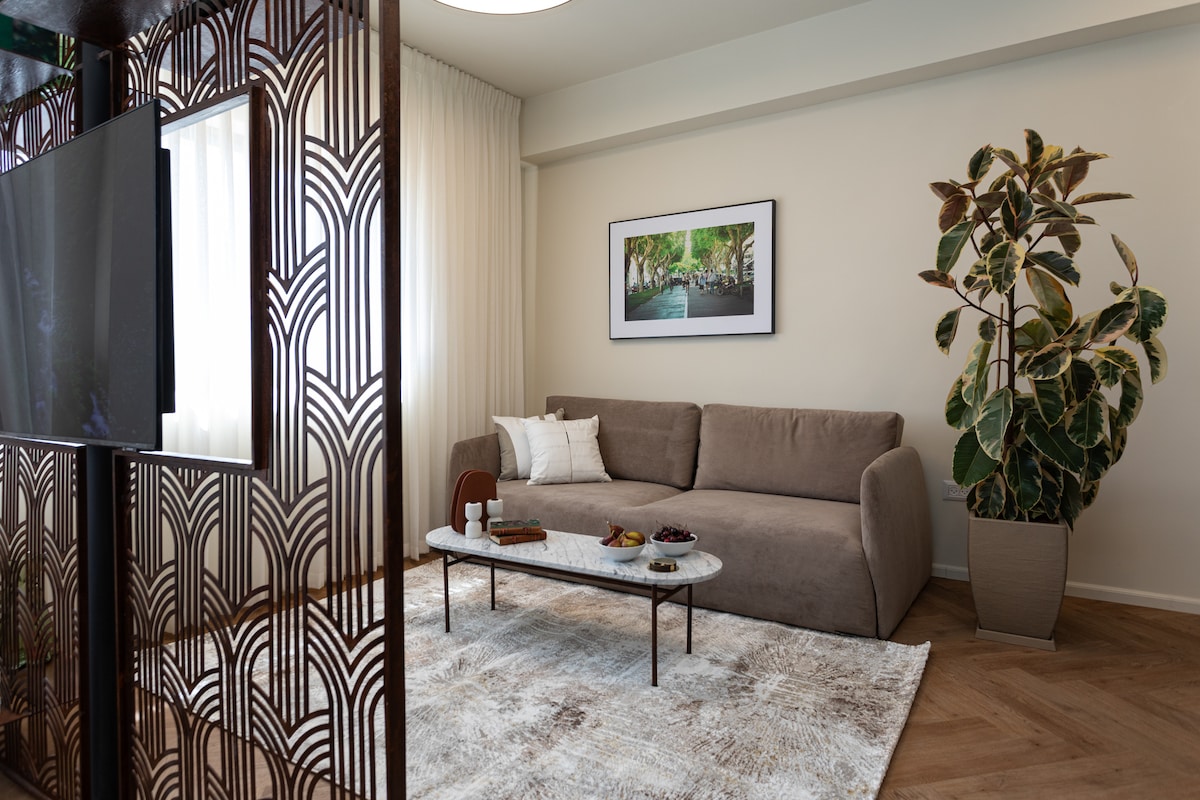 De Green Suite takes inspiration from the urban nature of the city and Shenkin Street. Its shades of green and bright colors create a serene and peaceful atmosphere, with a view of the beautiful Shenkin Garden visible from its windows. special artistic touches were commissioned, The suite includes one bedroom with satin bedding, equipped kitchen, dishwasher, refrigerator, espresso machine, smart TVs, luxurious bathroom , advanced air conditioning, safe. PRIVATE SHELTER IN THE BUILDING