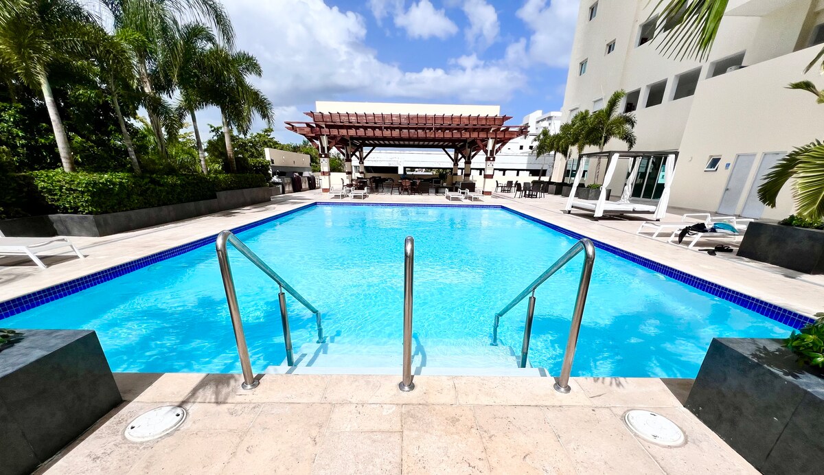 Enjoy this fully equipped apartment with poolside view in a private residence with 24 hour security. Smart lock for self check-in and security camera in hallway. Multiple towels, bed sheets and comforters. 5 mins from Hemingway Beach 15 mins from Boca Chica Beach 15 mins from San Pedro de Macoris 25 mins from SDQ International Airport 45 mins from La Romana International Airport 45 mins from Santo Domingo 1 Hour from Punta Cana