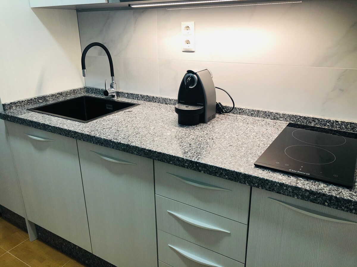 Encantador y moderno Estudio recien reformado, en el centro de Arroyo de la Miel, Benalmadena, cerca de bares, restaurantes, cafeterias, supermercados y todo tipo de comercios. Totalmente equipado con lo necesario para pasar unas agradables vacaciones. Preciosa vista al mar desde el balcon. La playa se encuentra a unos 10 minutos a pie. Hay estacionamiento privado gratuito para el edificio (sujeto a disponibilidad). Por mantenimiento no podemos asegurar la utilización de piscinas este año.