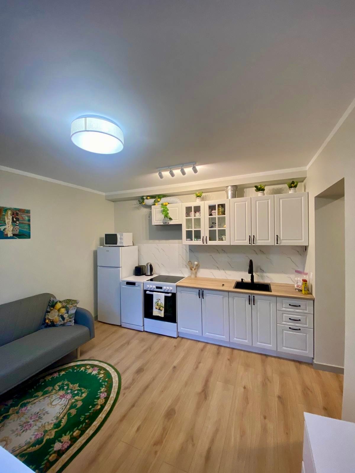 Elegante apartamento con aire acondicionado en el tercer piso que consta de dormitorio principal con cama tamaño king, una espaciosa sala de estar tipo estudio y cocina, así como un acogedor balcón para el café de la mañana. La sala de estar tiene un sofá desplegable para espacio adicional para dormir, TV inteligente con canales de cable populares y, por supuesto, conexión wifi de alta velocidad, de forma gratuita.