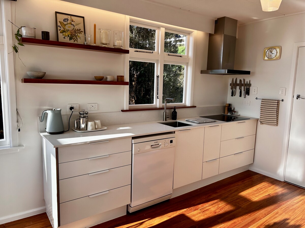 Ubicada entre los árboles autóctonos, en la soleada colina sur, se esconde una joya de mediados de siglo. Elevada sobre el jardín con una terraza que completa la casa y ofrece vistas privilegiadas al mar y al amanecer. A 2 minutos colina abajo se encuentra el recinto histórico lleno de muchas delicias, como pingüinos azules, panadería, café, galerías de arte y cervecerías. Las playas de arena dorada de la costa este están a solo 10 minutos en coche.
