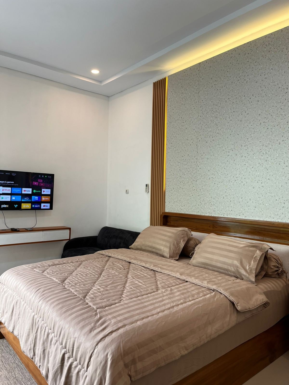 Guesthouse di tenh Magelang. Bangunan baru, fasilitasạkap! Dormitorio: 1 cama tamaño king con aire acondicionado. 2 camas individuales con aire acondicionado. 1 cama queen con aire acondicionado. 1 cama supletoria gratis. Baño: 2 baños Calentador de agua Sala de estar con ducha: Sofá Smart TV 50 Cocina: Juego de cocina Equipamiento de cocina completo Mesa de comedor Refrigerador Microondas Magia com Hervidor de agua Smarthome Agua mineral Té, café Servicio adicional: Lavadora Wifi Cuenta de Netflix Área de estacionamiento con cuenta premium DE YouTube